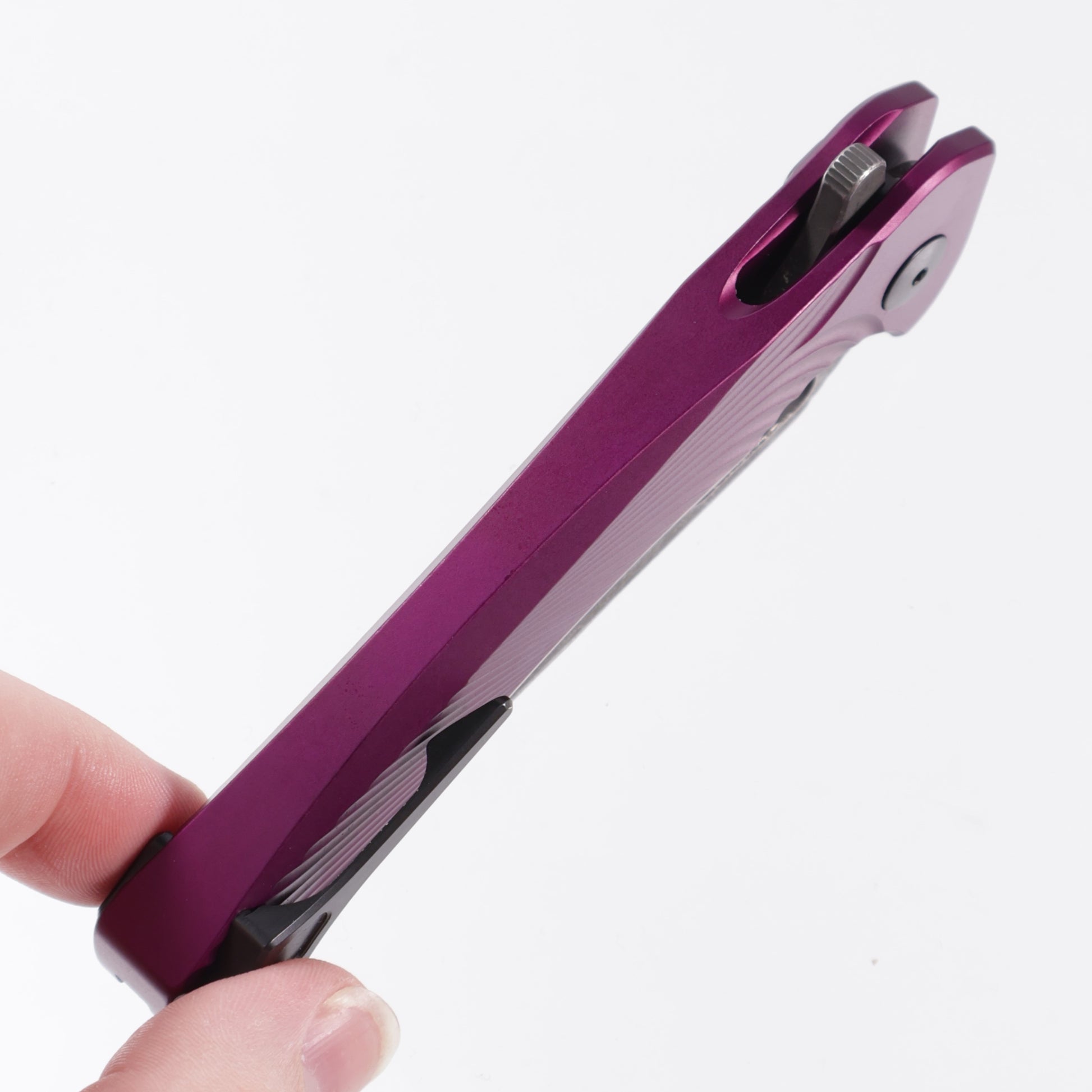 Dead Reckon Knives Ridgeback - Aluminum Purple Textured, Modified Blade Shape, Series 1, S45vn, Button Lock, Dark Stonewash
