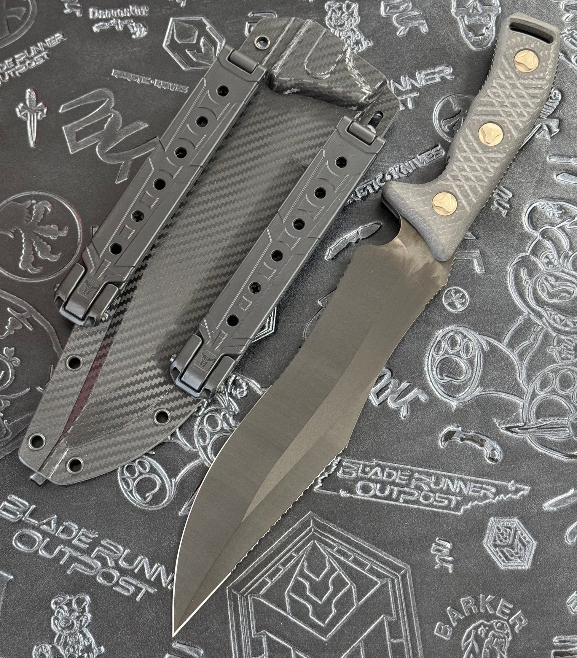 The Arbiter® is a fixed blade knife boasting a large size and unique shape. The clip point blade comes to a point with an upper and lower cutting edge. Proprietary tri-wing hardware fastens the G-10 handle, which features a lanyard hole and breaker pommel. A truly impressive knife at its size, the Arbiter® is the largest fixed blade in our lineup and a formidable addition to your collection.