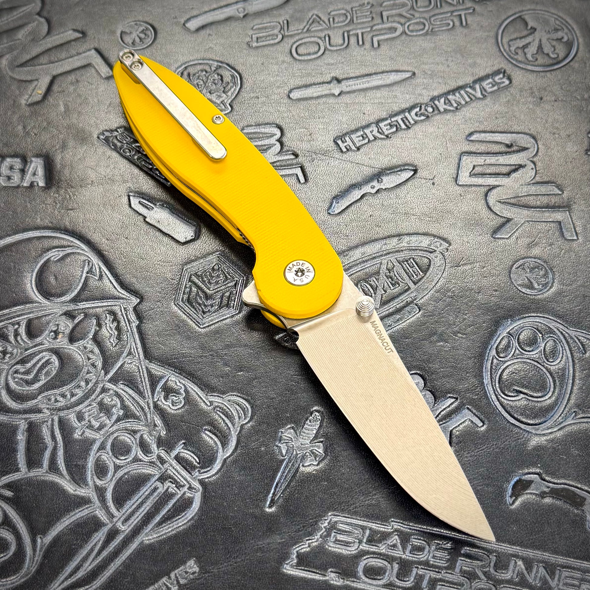 American Blade Works Model 1 V7 featuring a Magnacut blade & yellow G10 handle scales!