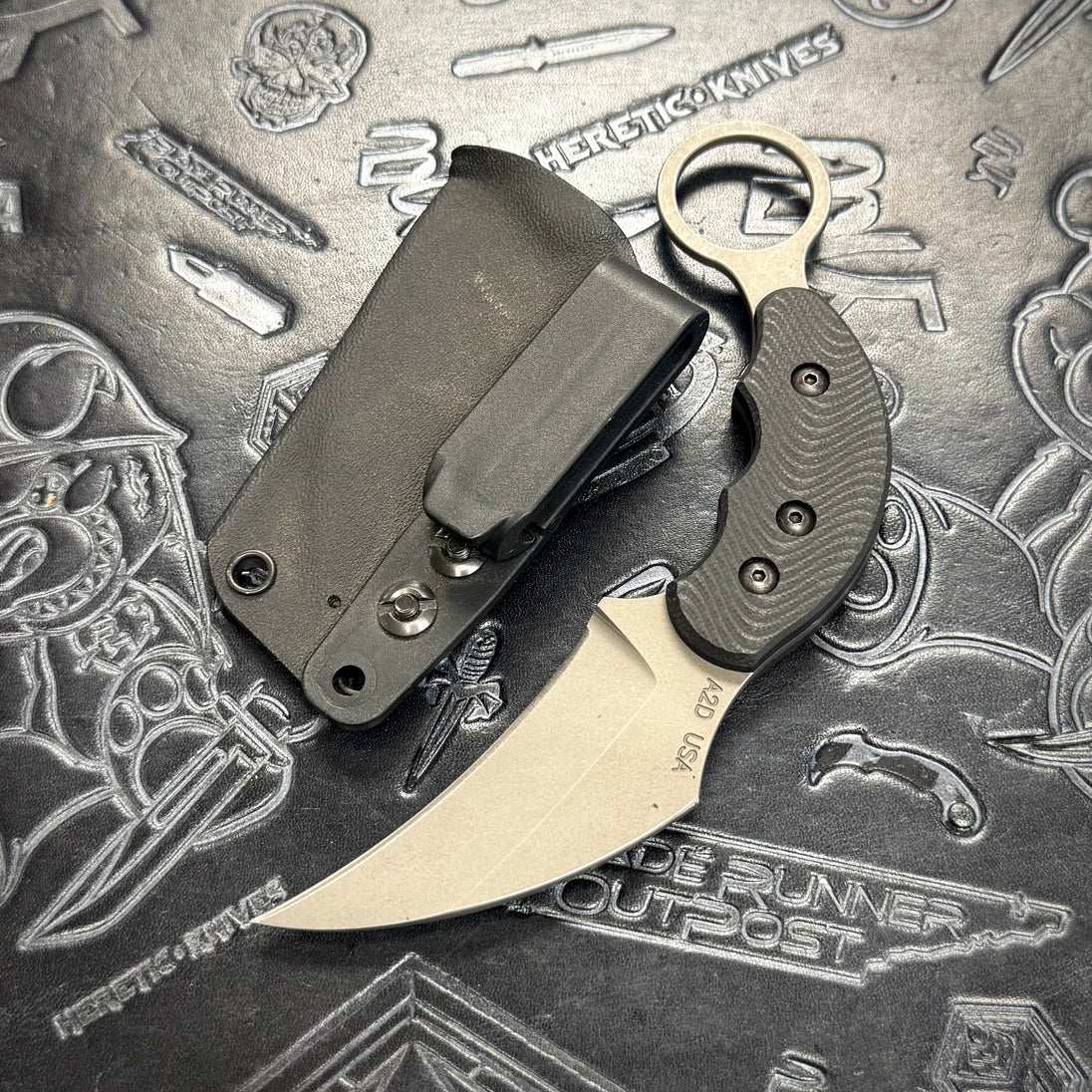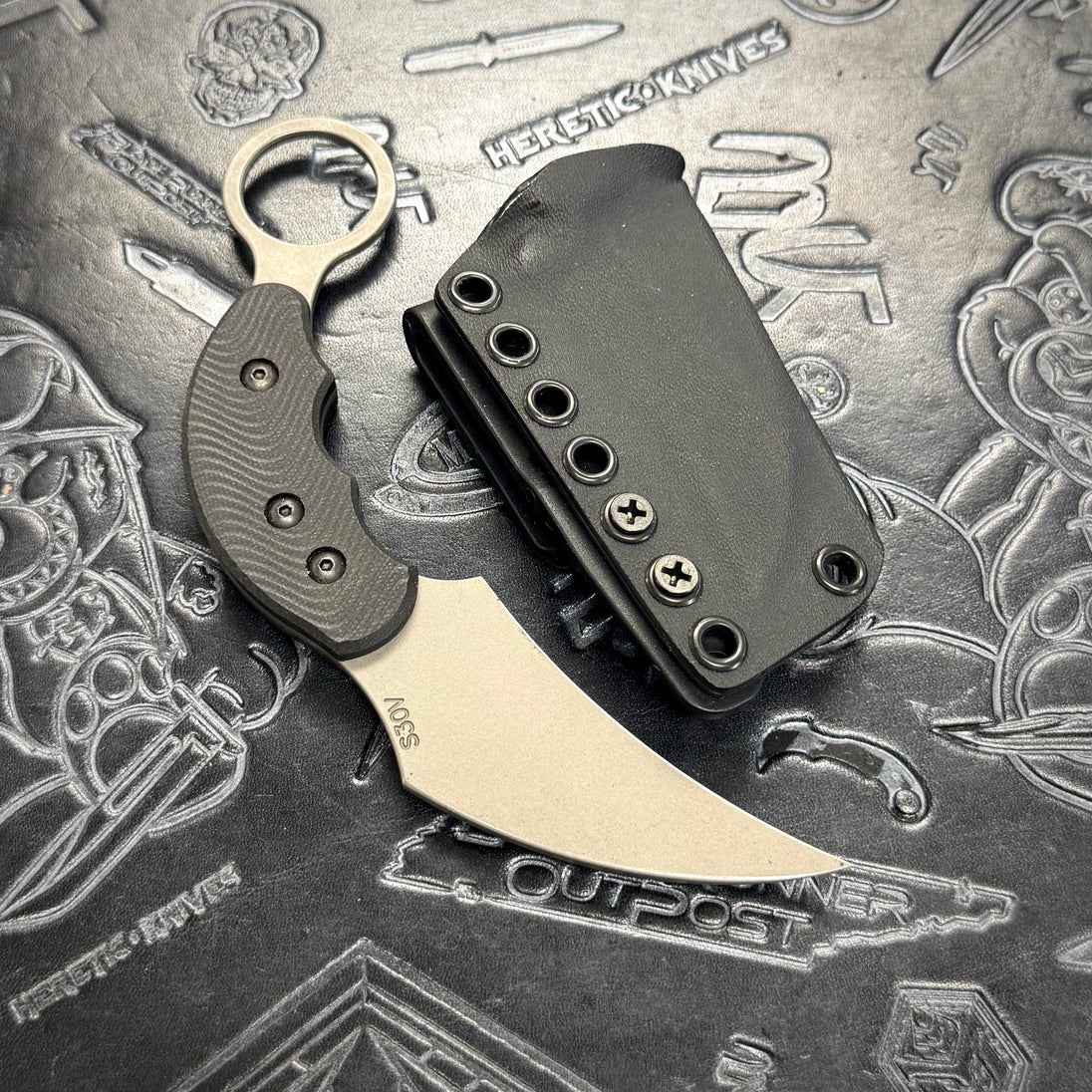 Attn2Detail Karambit fixed blade featuring flow black G10 scales & a single edge Stonewash finished S30V blade! Includes Kydex Sheath.