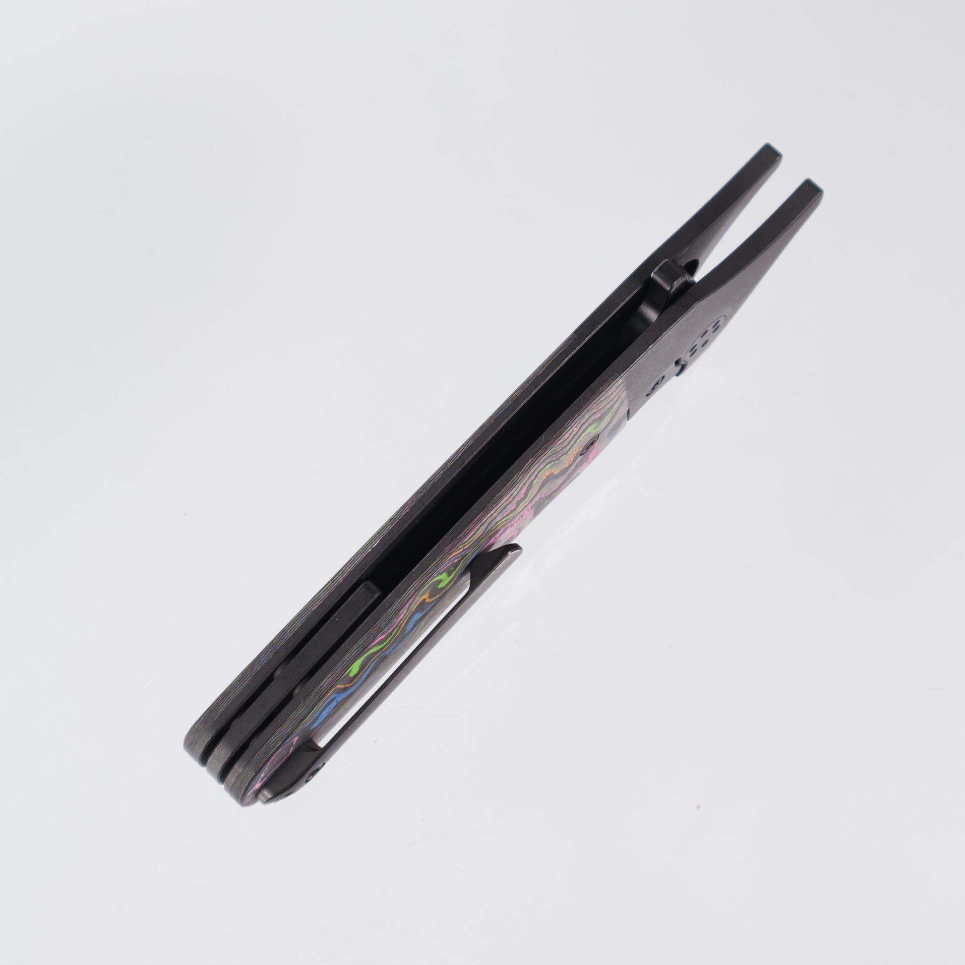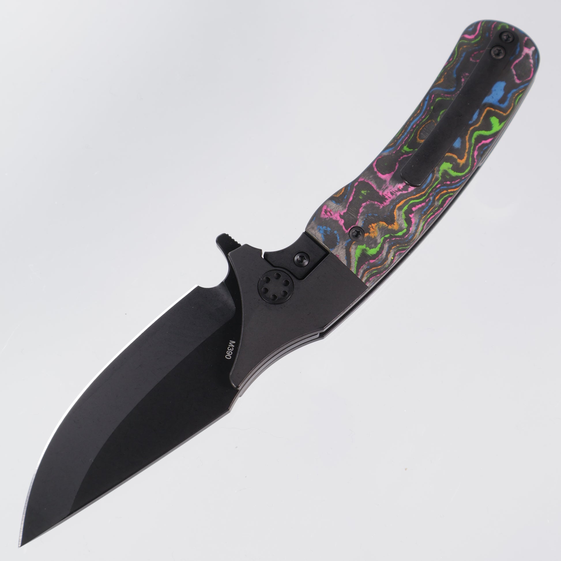 Beans Blades Javelin Folder featuring a PVD titanium frame, 80s Camo Carbon inlays & a PVD M390 blade!