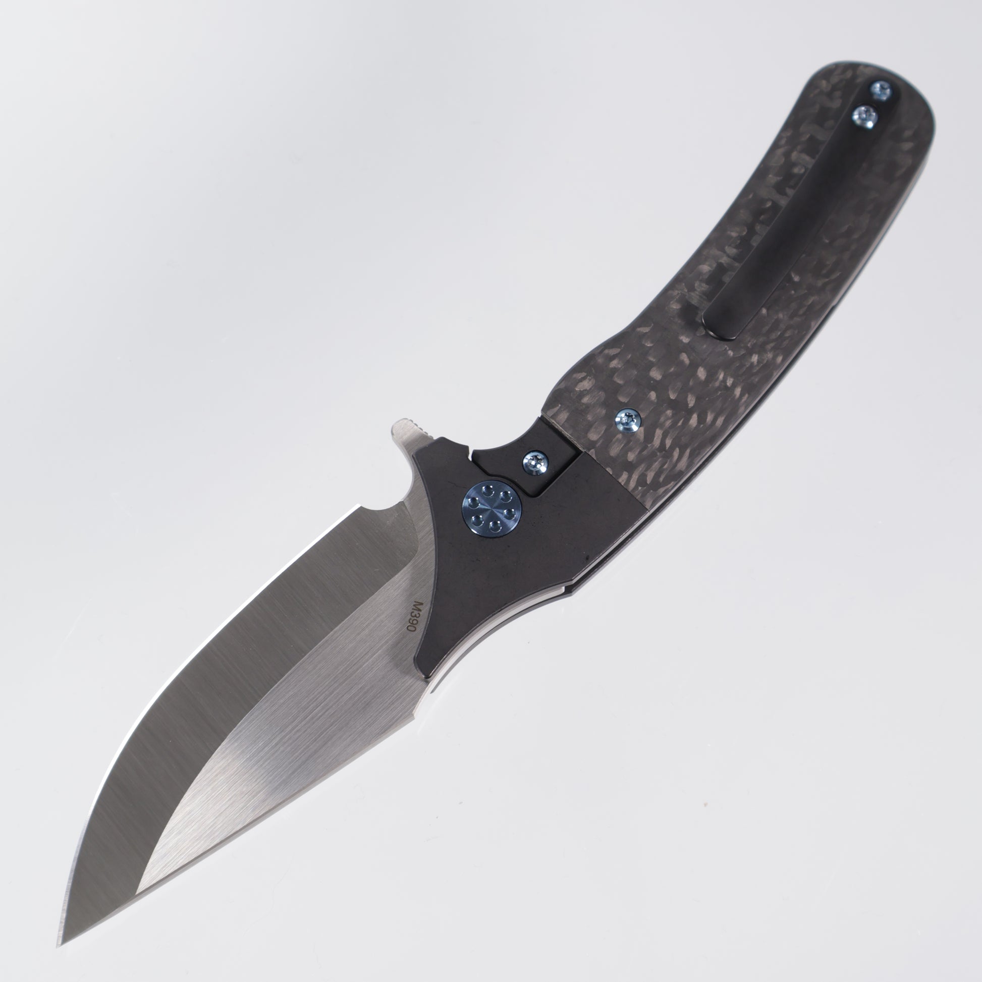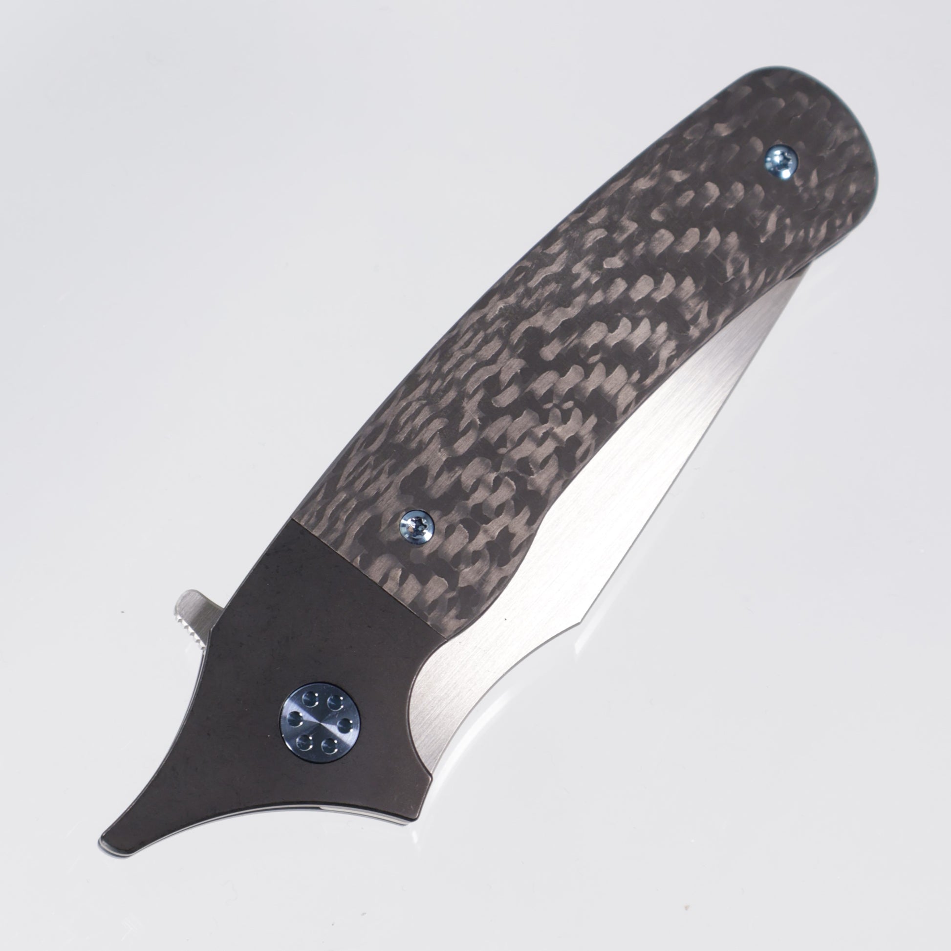 Beans Blades Javelin Folder featuring a black PVD titanium frame, carbon fiber twill inlays, blue anodized hardware & a satin M390 blade!