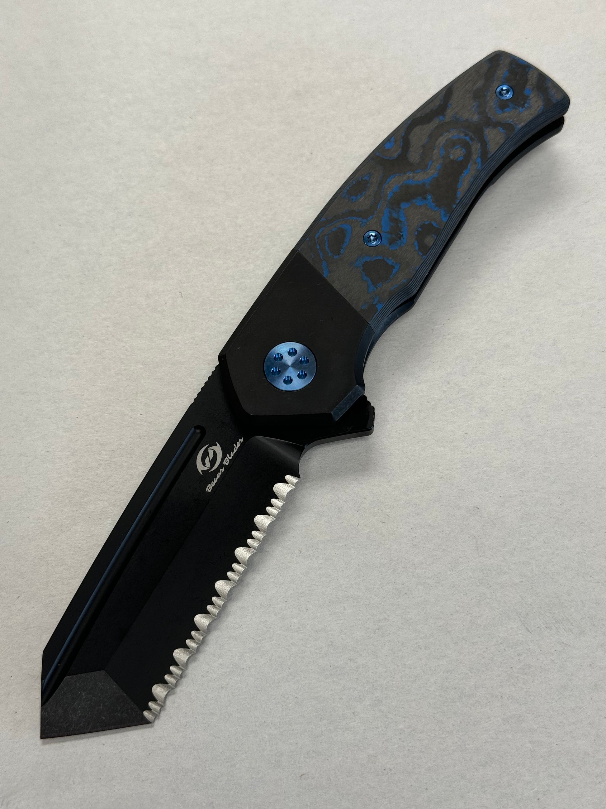 Beans Blades Mini Warrior Folder - Electric Blue Carbon Fiber, Full Serrated PVD M390