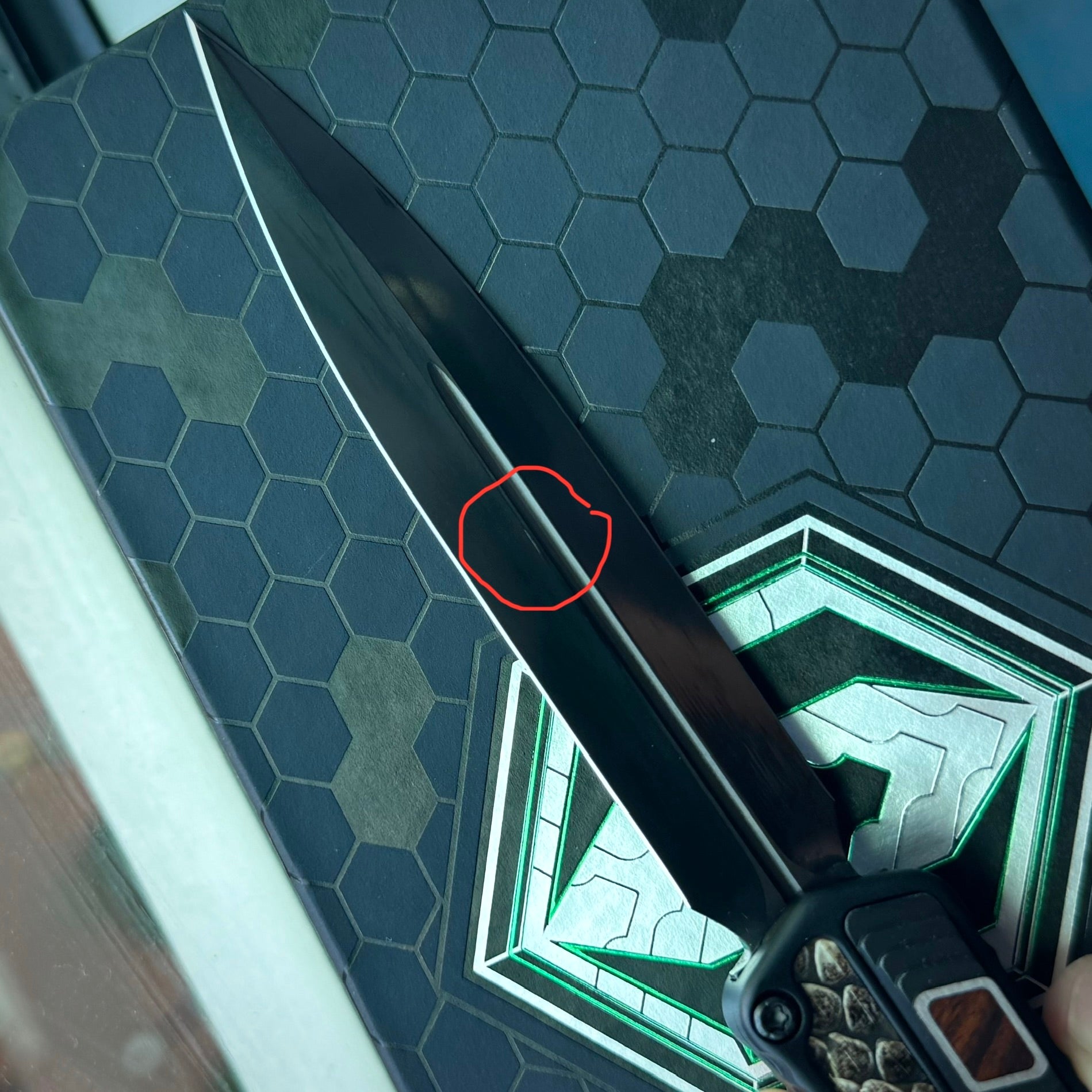 as you can see in the photos this particular knife has a small mark in the DLC on the blade that is circled in red, the box also has a red dot on the label to denote the blemish. Authorized discount applied for this particular piece. It is S/N: 016