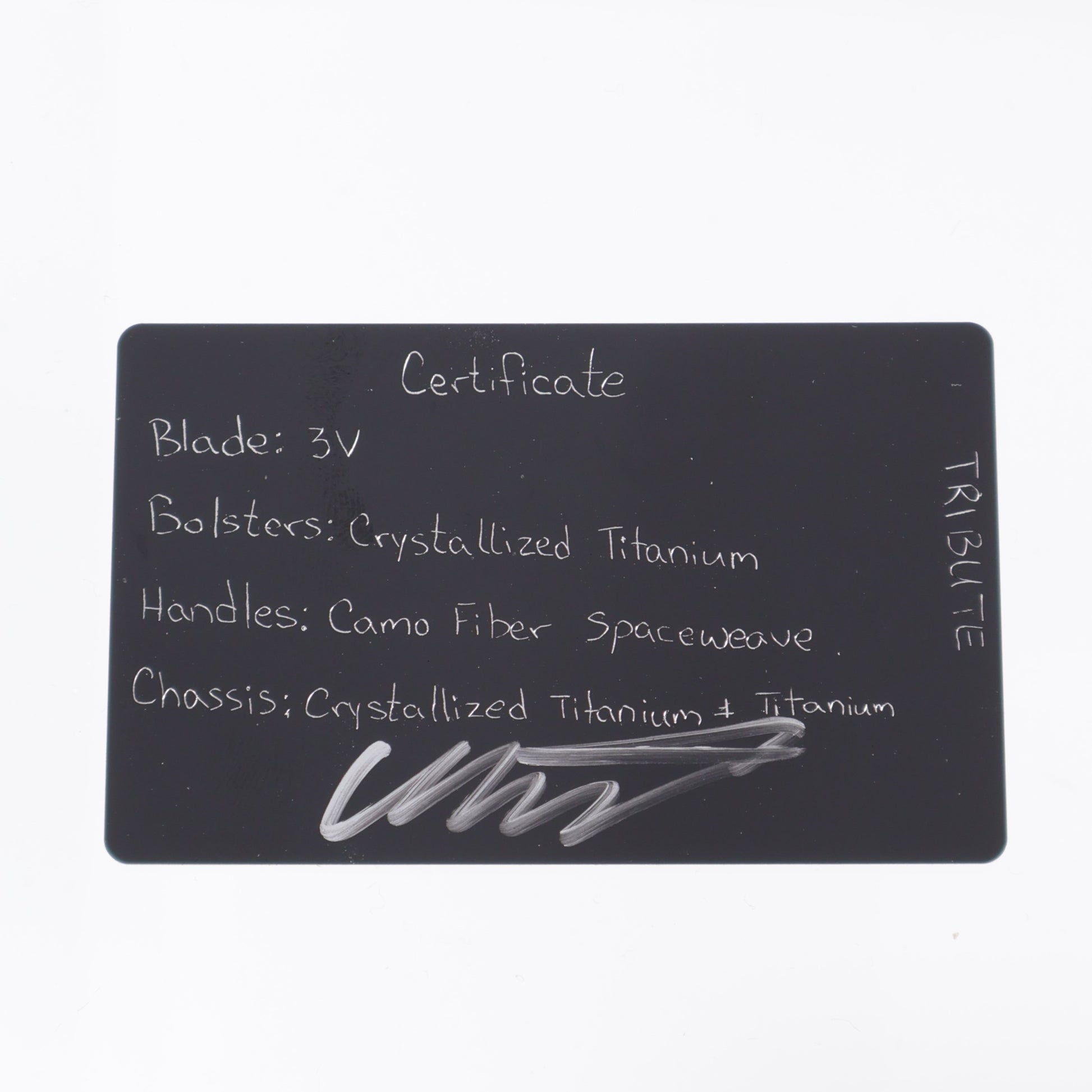 Custom Manual Tribute from Brandon Vallotton featuring crystalized titanium bolsters, green Space Weave Camo Carbon inlays & a heat colored 3V Blade!