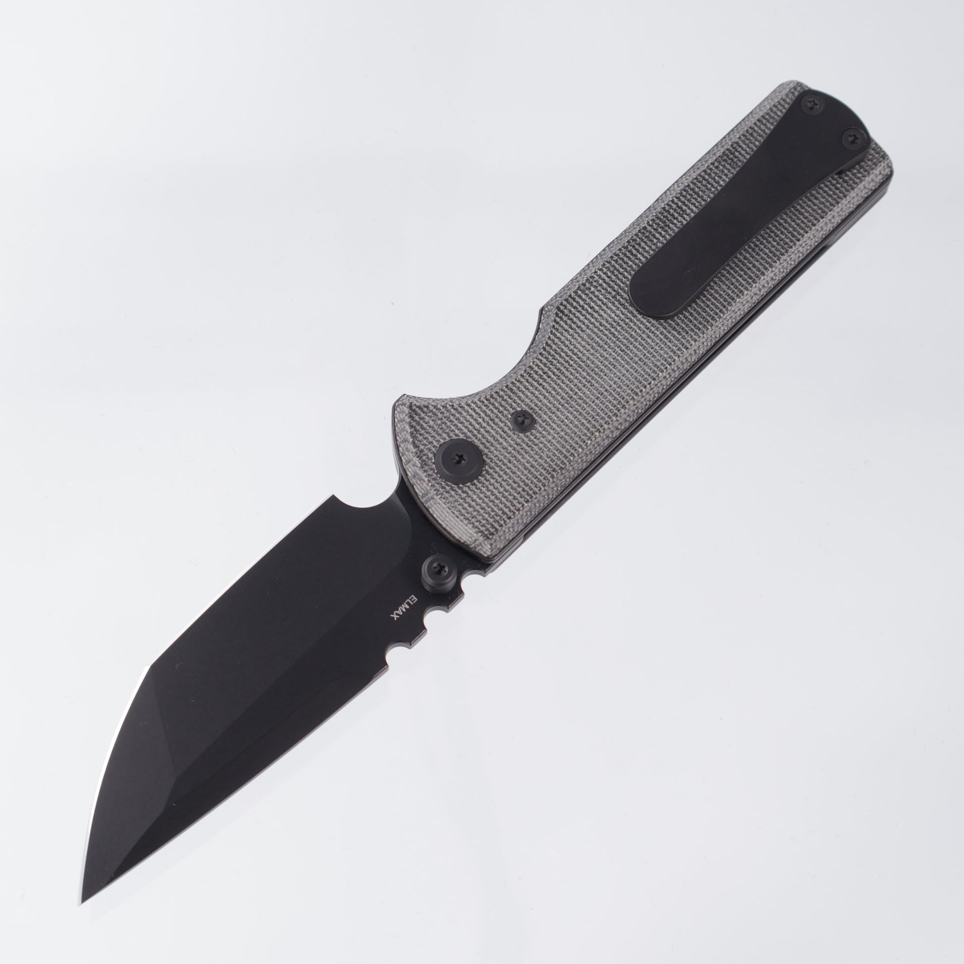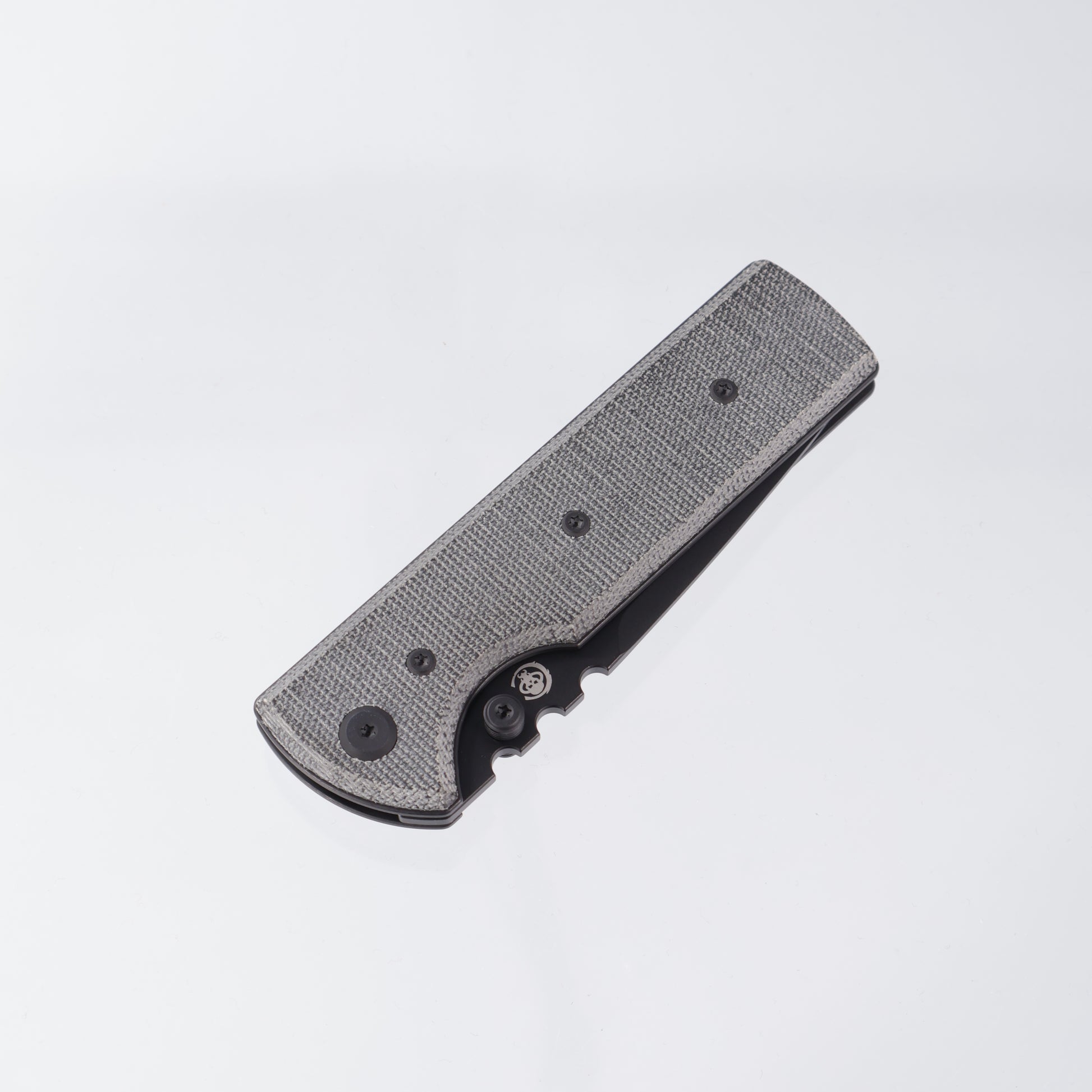 The Chaves NTAK Folding Knife with a Black PVD/Satin DropPoint/Tanto Blade and Black Canvas Micarta Handle - Not Tiny Ass Knife