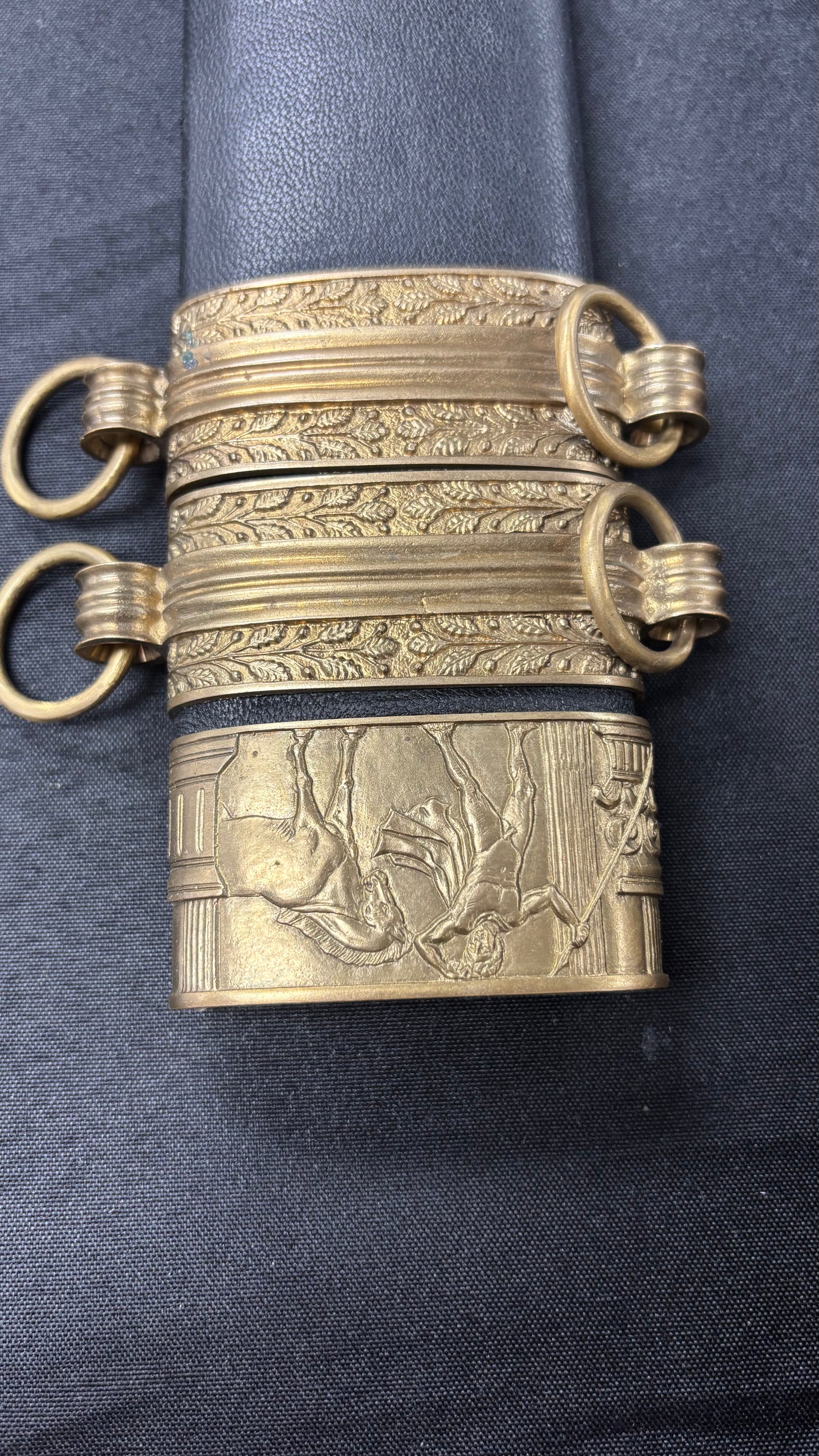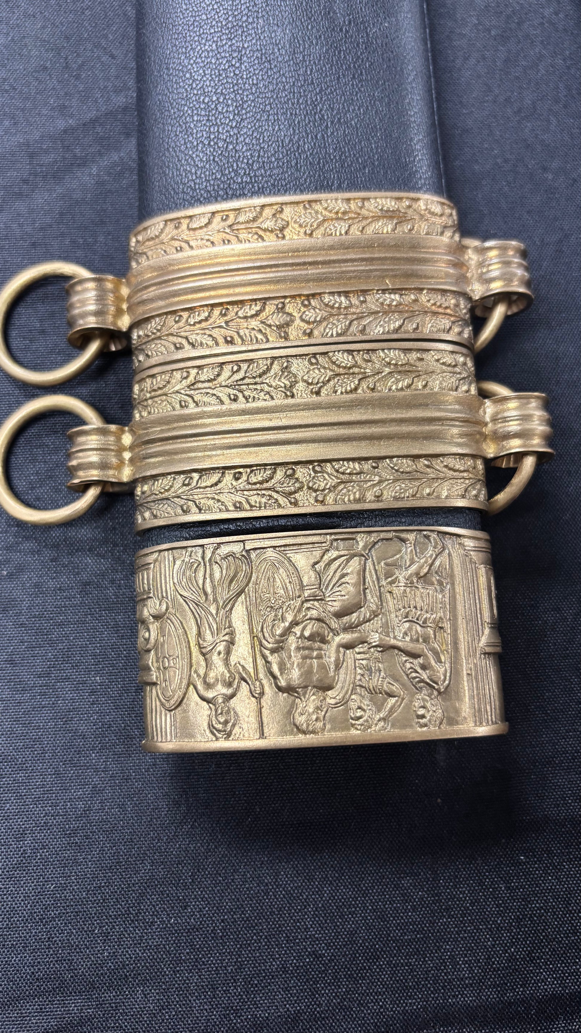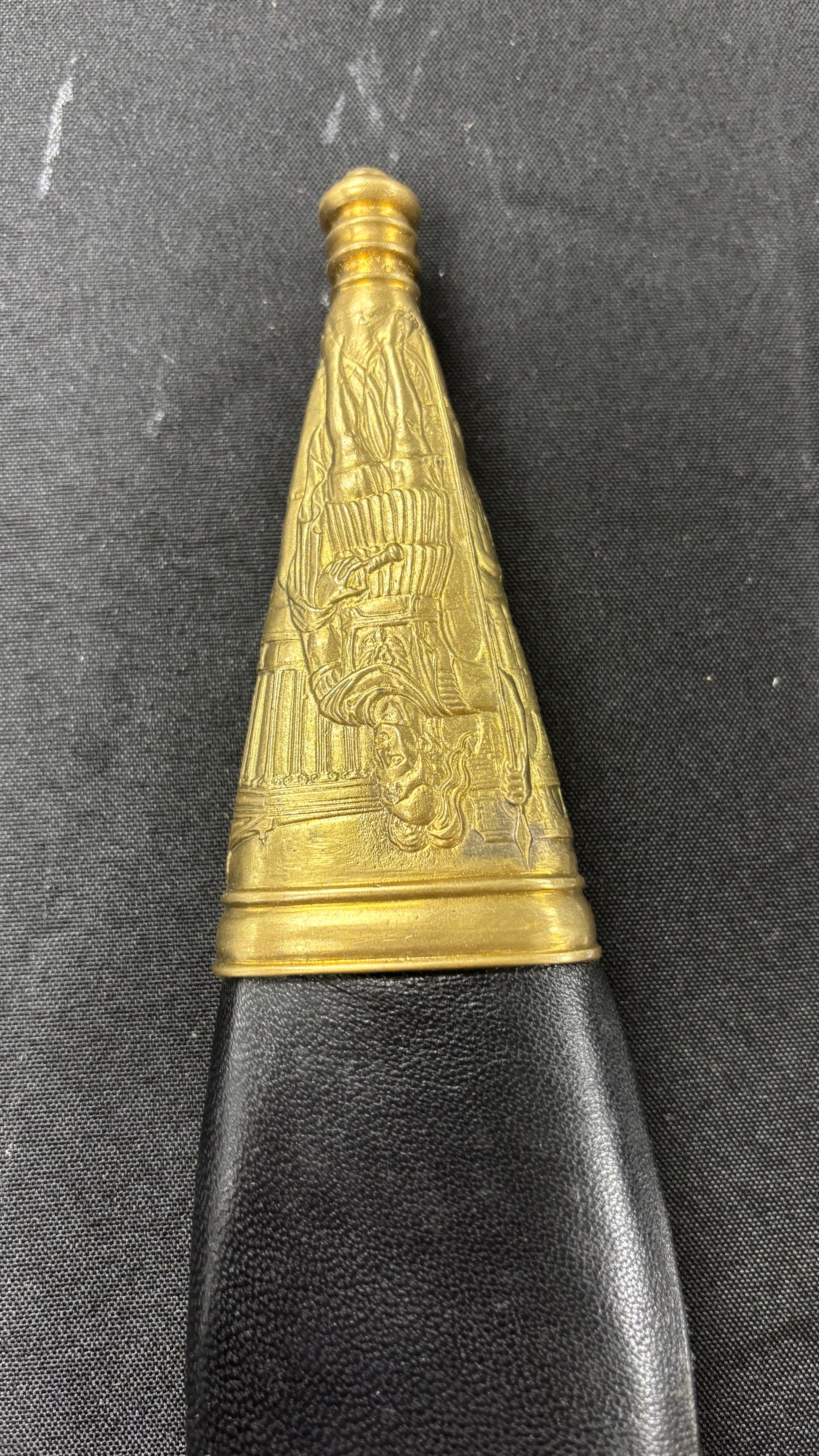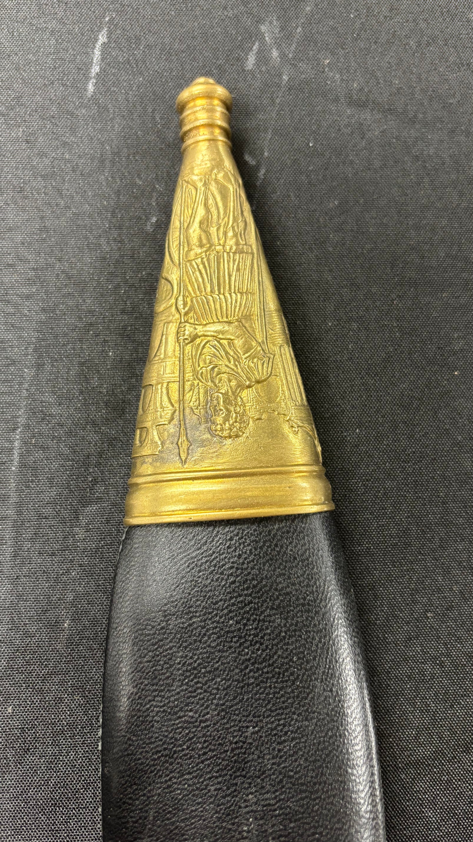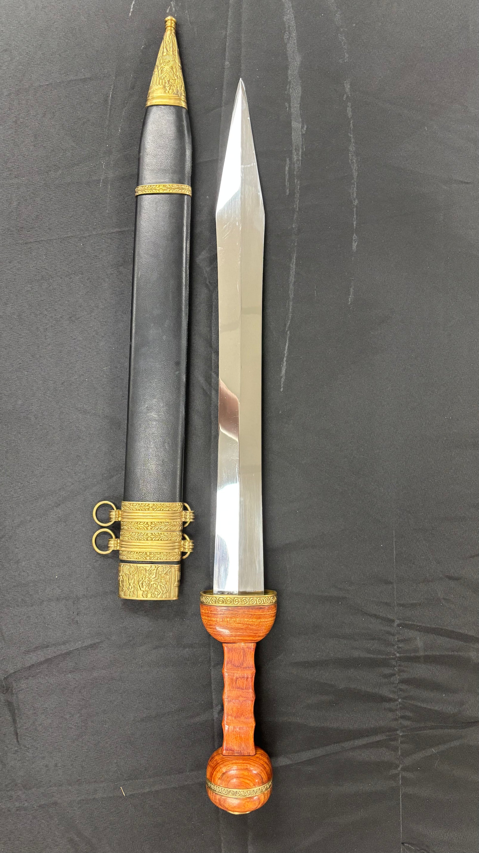 The Roman Gladius is perhaps the most well-known piece of ancient weaponry. It’s simple and long, double edge blade which had a long point, made it an ideal stabbing or piercing weapon that could defeat the body armor of its day. Cold Steel’s® interpretation is not a reproduction of a specific ancient Gladius, but is a collection of this venerable sword’s major features. The blade, for example, has the traditional shape, but, unlike the ancient version, is made from high carbon steel with a spring temper. It is fully sharpened on both edges and has a fine mirror polish. The point is long, but sturdy enough to resist bending or breaking. It also features a Rosewood grip, carved, and decorated in the classical style. The wood scabbard is covered in black leather and accented with a throat, chape, and carrying rings made of solid brass. Undeniably a showpiece, the Cold Steel® Gladius, like all our swords, is fully functional and battlefield ready.