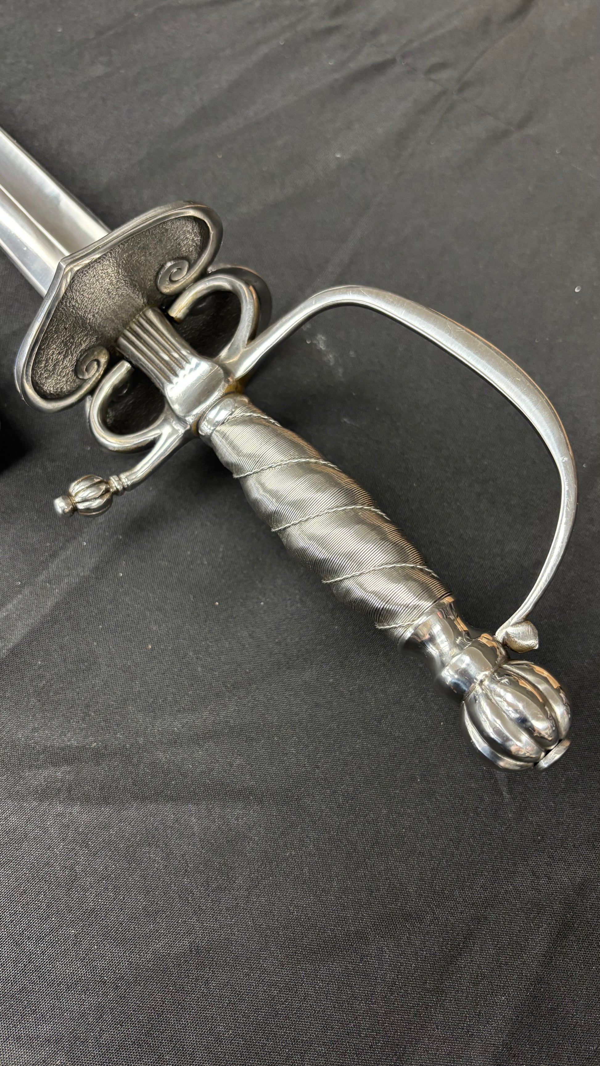 The Colichemarde emerged on the sword scene in the late 1600's during the decline of the Rapier and the rise of the small sword. Its long suit was its uniquely shaped blade that was extra wide at the forte then stepped down or narrowed for the rest of its length before ending in a wicked point. The advantage of this configuration was it allowed the sword to be used to parry or oppose even the heaviest weapons without breaking, yet remain light and supple enough to take full advantage of its lightning quick point. The Colichemarde has great versatility in attack or defense so we enlisted the aid of our good friend Dave Baker, and made our own modern interpretation. True to form, our blade mirrors the original design concepts with an extra long and wide forte that abruptly tapers down to an acute and deadly point. The hilt features a decorative, yet highly functional, double shell guard, complete with finger loops and knuckle bow, while the grip is completely wire wrapped and capped with a matching pummel. Additionally, we have also taken the liberty of creating a matching dagger with a stiff, beautifully ground and polished blade, double quillons, and wire wrapped handle.