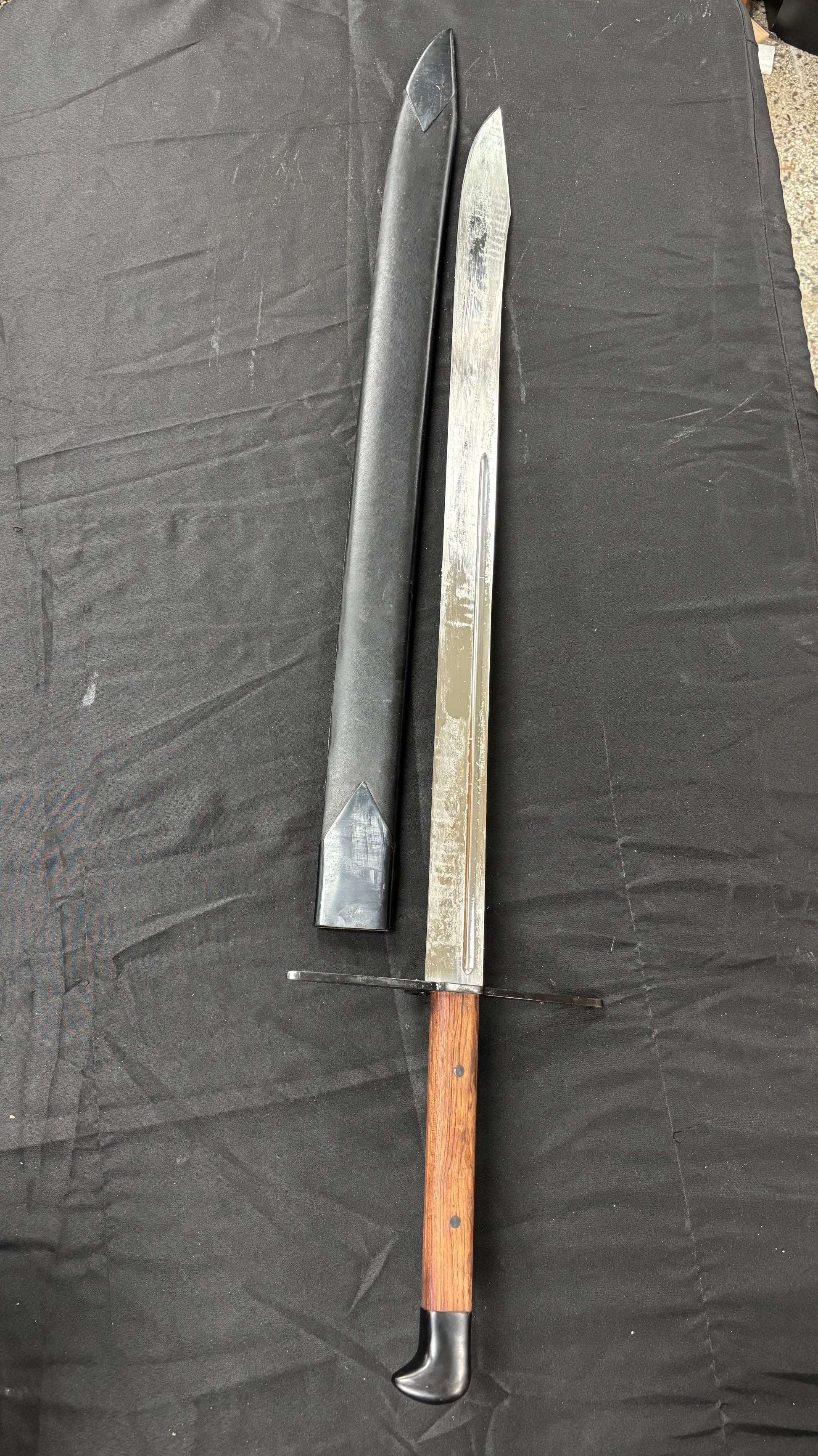 The German Grosse Messer (big knife) is one of the largest of the blades that fall under the classification of Messer. It can be wielded in one or both hands and is capable of astonishing cutting feats. Cold Steels modern version of this historical classic features a hand-forged blade of 1060 carbon steel thats so sharp weve used it to split a telephone book in half, with a single blow! The guard and pommel are made from blued steel and feature rosewood handle scales strongly riveted to the swords full tang. The Grosse Messer also comes with a handsome wood and leather scabbard, reinforced with a steel chape and throat that has been blued to match the guard and pommel.