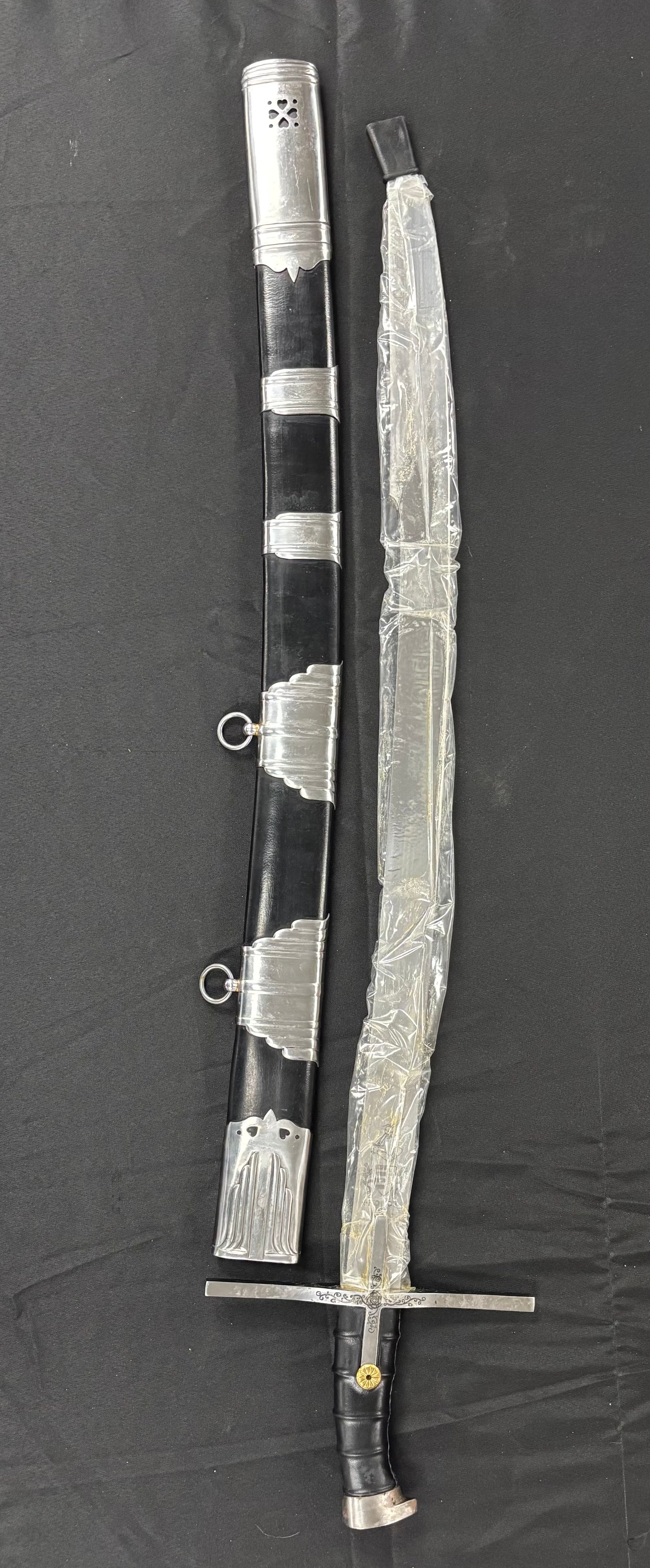 Swords from the personal collection of Lynn Thompson, founder of Cold Steel. Hand picked by Lynn Thompson and/or his team to be part of his personal collection. Comes with a Certificate of Authenticity signed by Lynn C. Thompson- President of Cold Steel Inc. Photos taken with Cosmoline protectant present on the blade. May be perceived as imperfections in the blade.