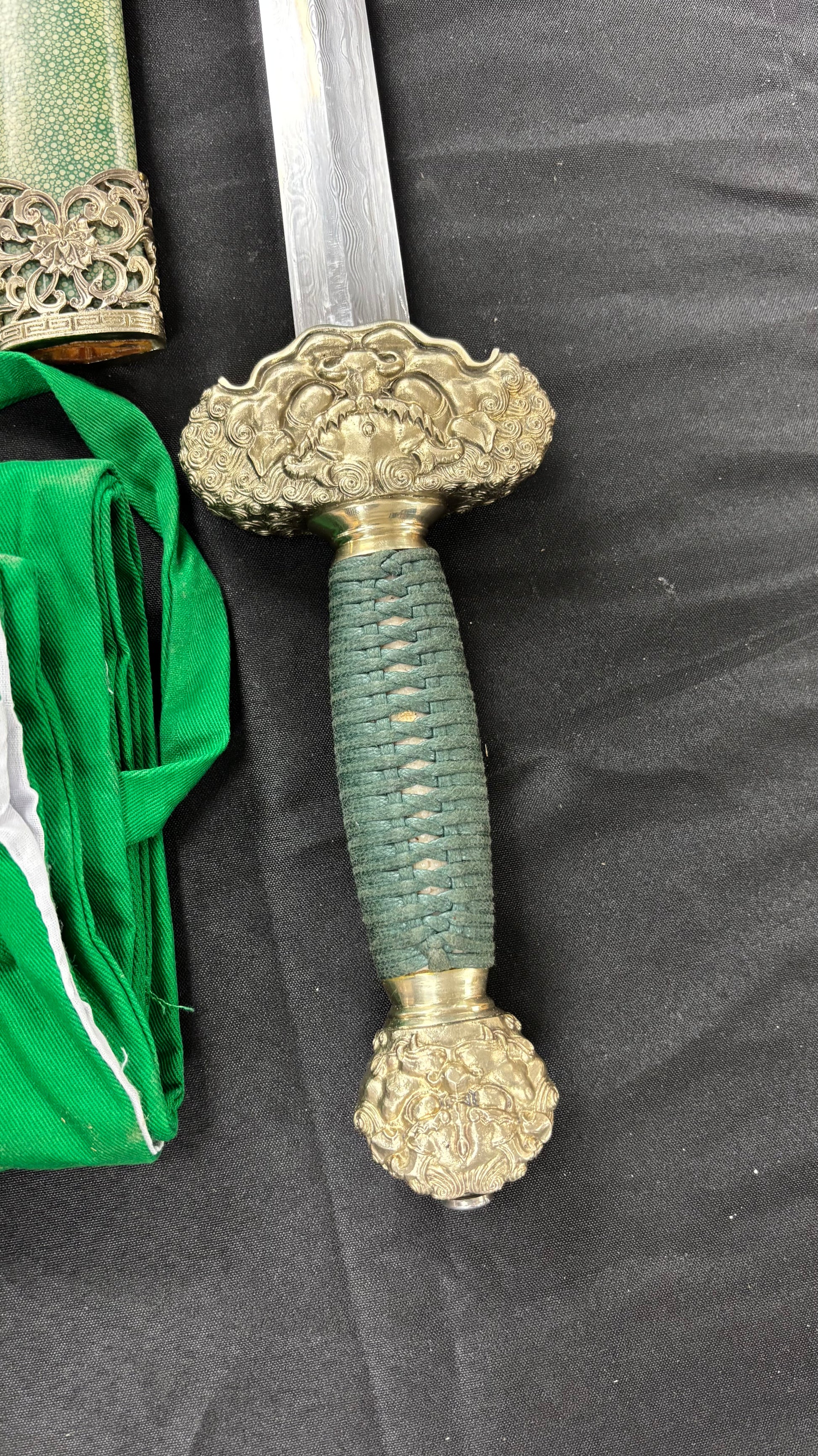 The Cold Steel Jade Lion series has proven to be incredibly popular with Chinese Martial Artists and blade collectors alike. Hand forged and expertly tempered from high-quality Damascus steel, their subtly patterned blades are as sharp as they are beautiful. The heavy guard and pommel are cast from nickel-silver and adorned with watchful Chinese lions. Providing exquisite contrast to the jade green cord and samé wrapped handles and very skin wrapped rosewood scabbards. The Lion Gim is a civilian self-defense Wen Jian (Scholars Sword), with a little more panache than the practical versions (like our own Gim Sword) that were made for the battlefield. In our tests it severed and pierced 4 bamboo poles with a single cut or thrust.