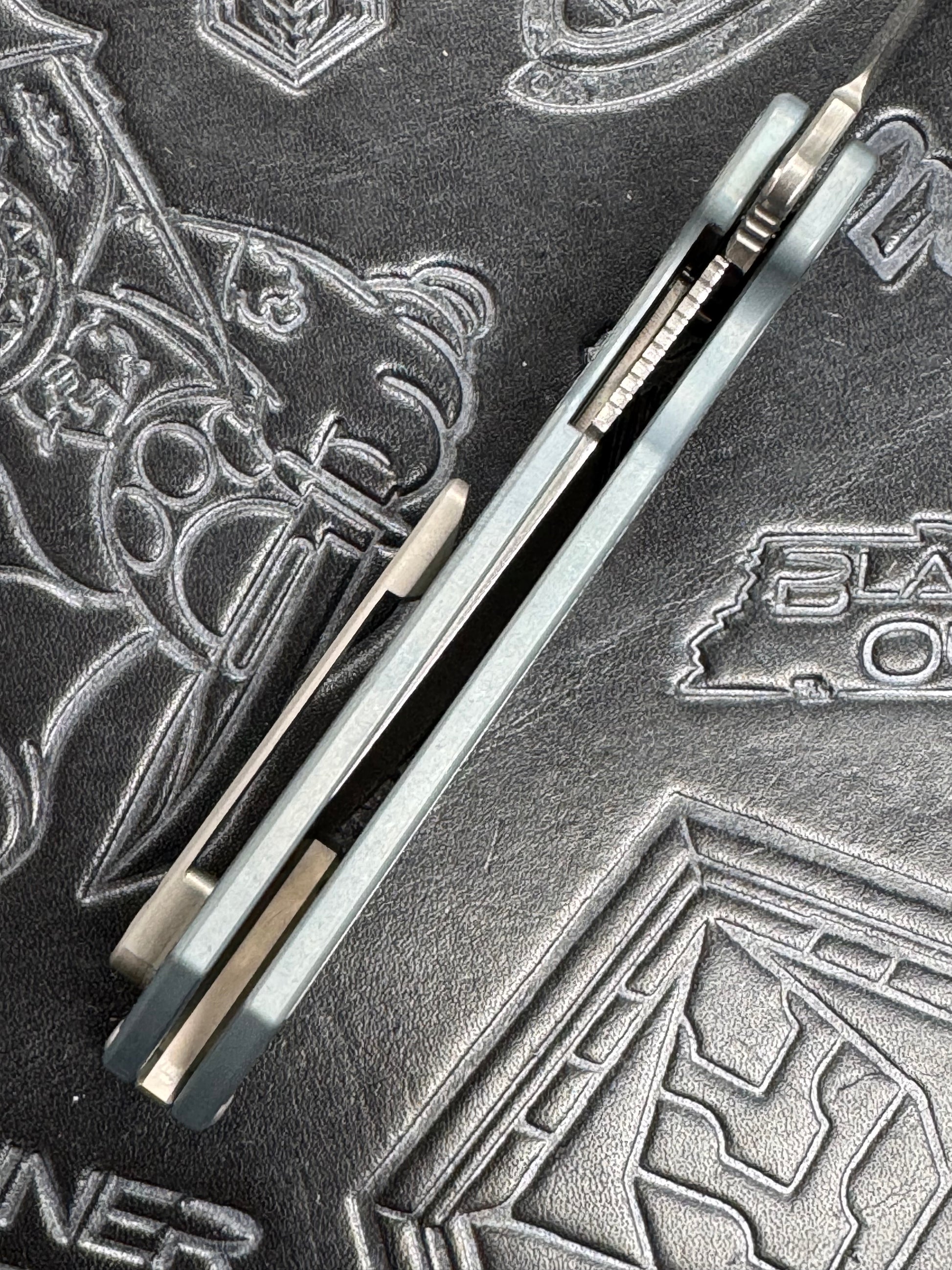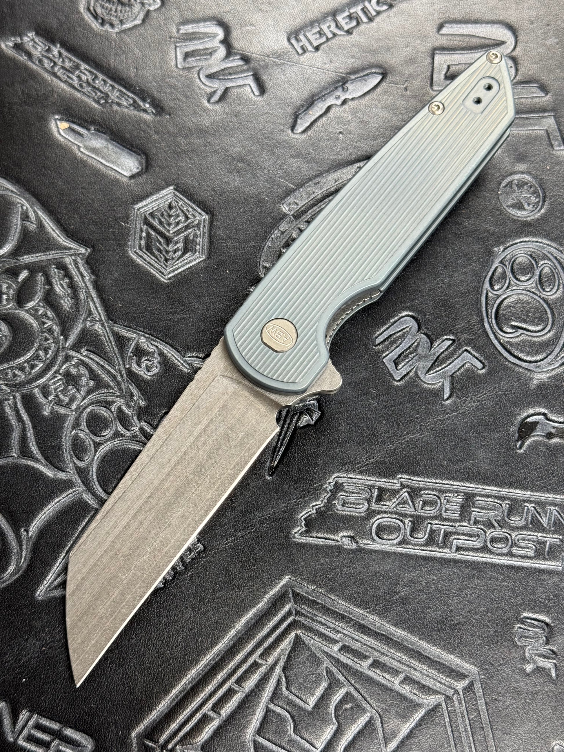 American Blade Works MODEL 2 TITANIUM Factory Light Blue Ano Wharncliffe Magnacut