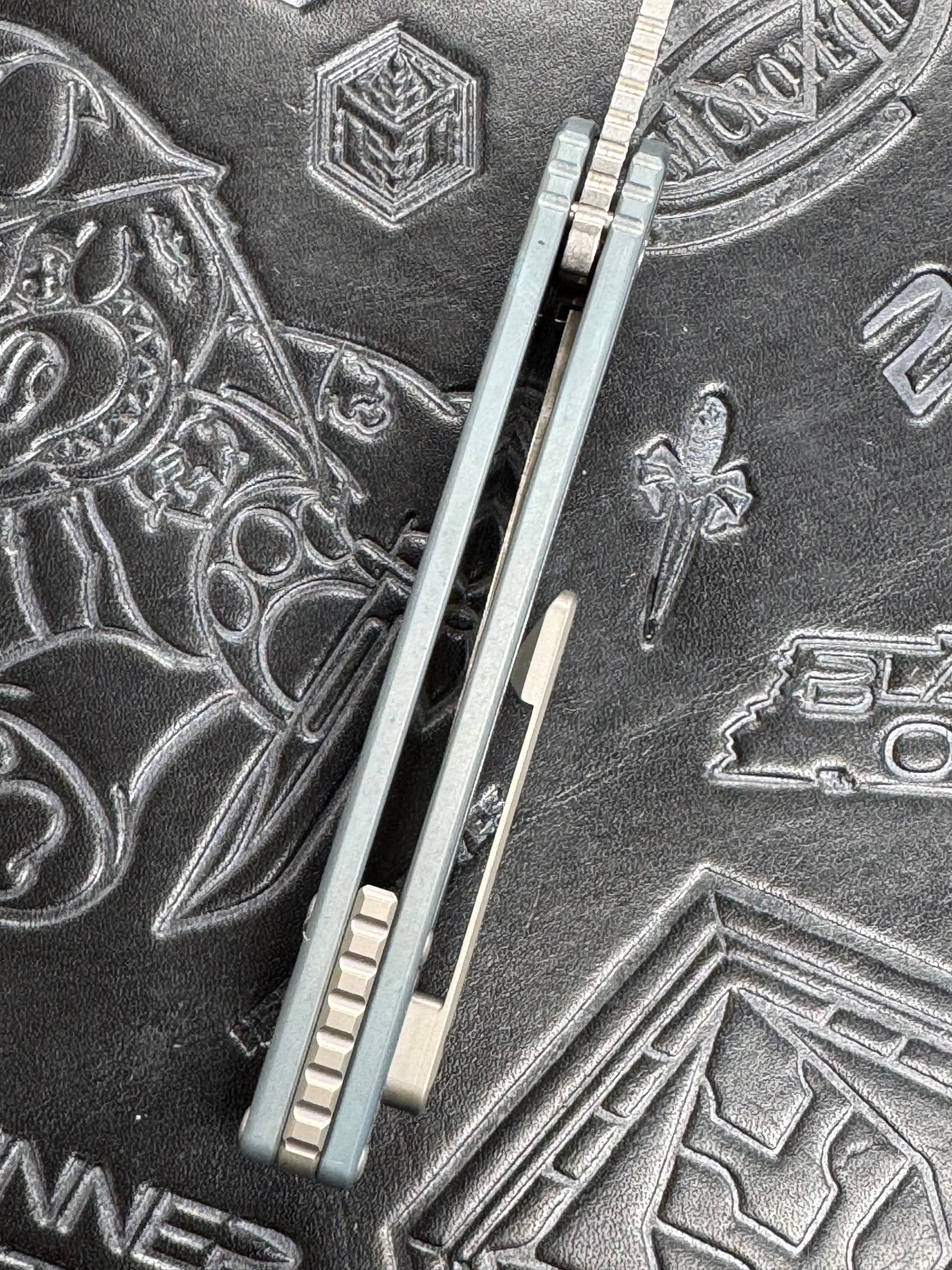 The Model 2 is a Titanium, mid-tech, flipper knife, with a liner lock. The blade is made of MagnaCut stainless that has been heat-treated and cryogenically tempered. The blade has a light stonewash finish and rides on ceramic caged bearings. It has a Ceramic detent ball. The pivot and pivot screw are made from hardened 416 stainless. The liners are 17-4 PH stainless with a titanium backspacer. The pocket clip is made from titanium.