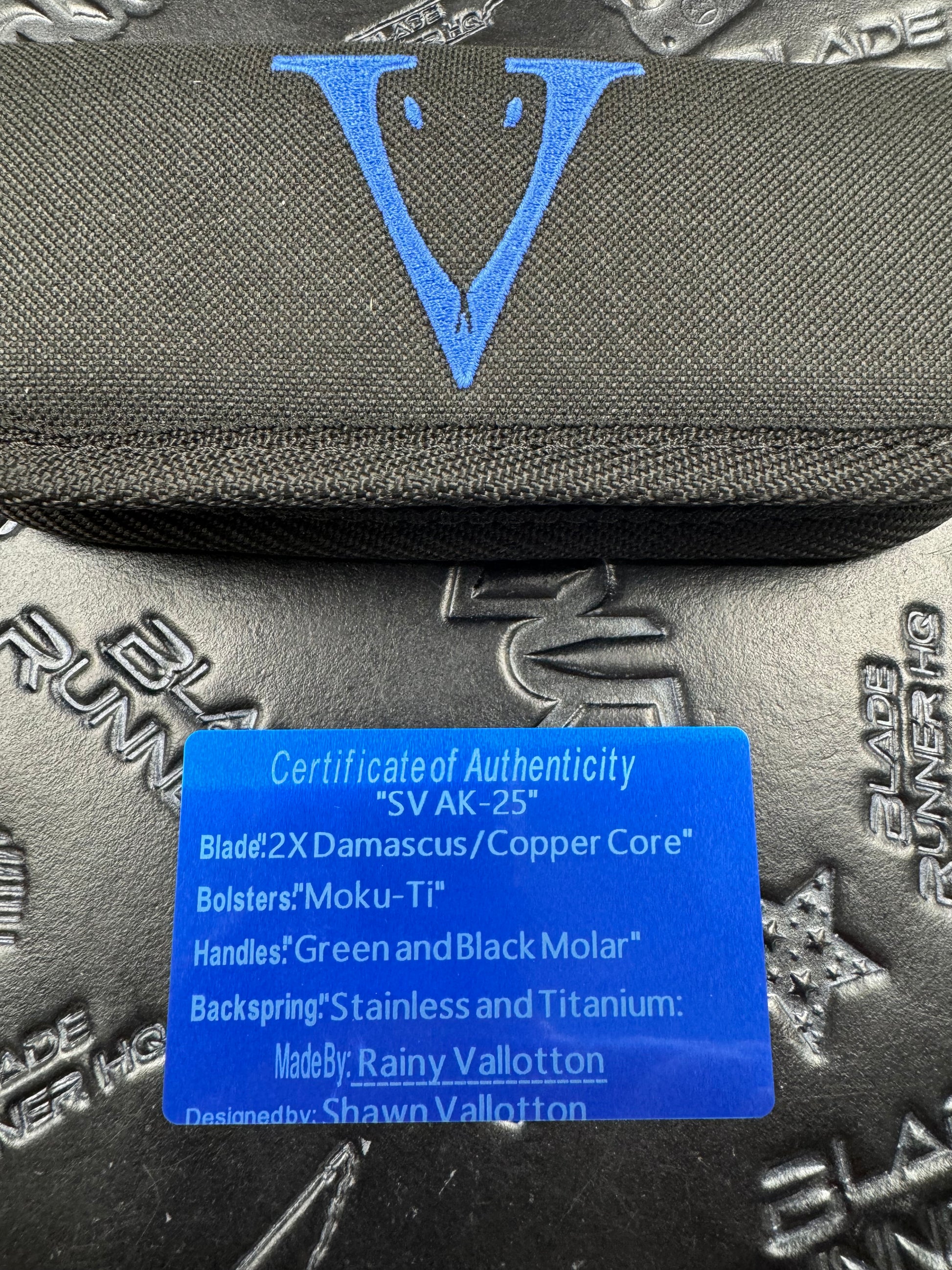 Valloton, Rainy - SV AK-25 2x Damascus / Copper Core Moku-Ti Bolsters Green & Black Molar Handles Custom Double Action D/A Folder