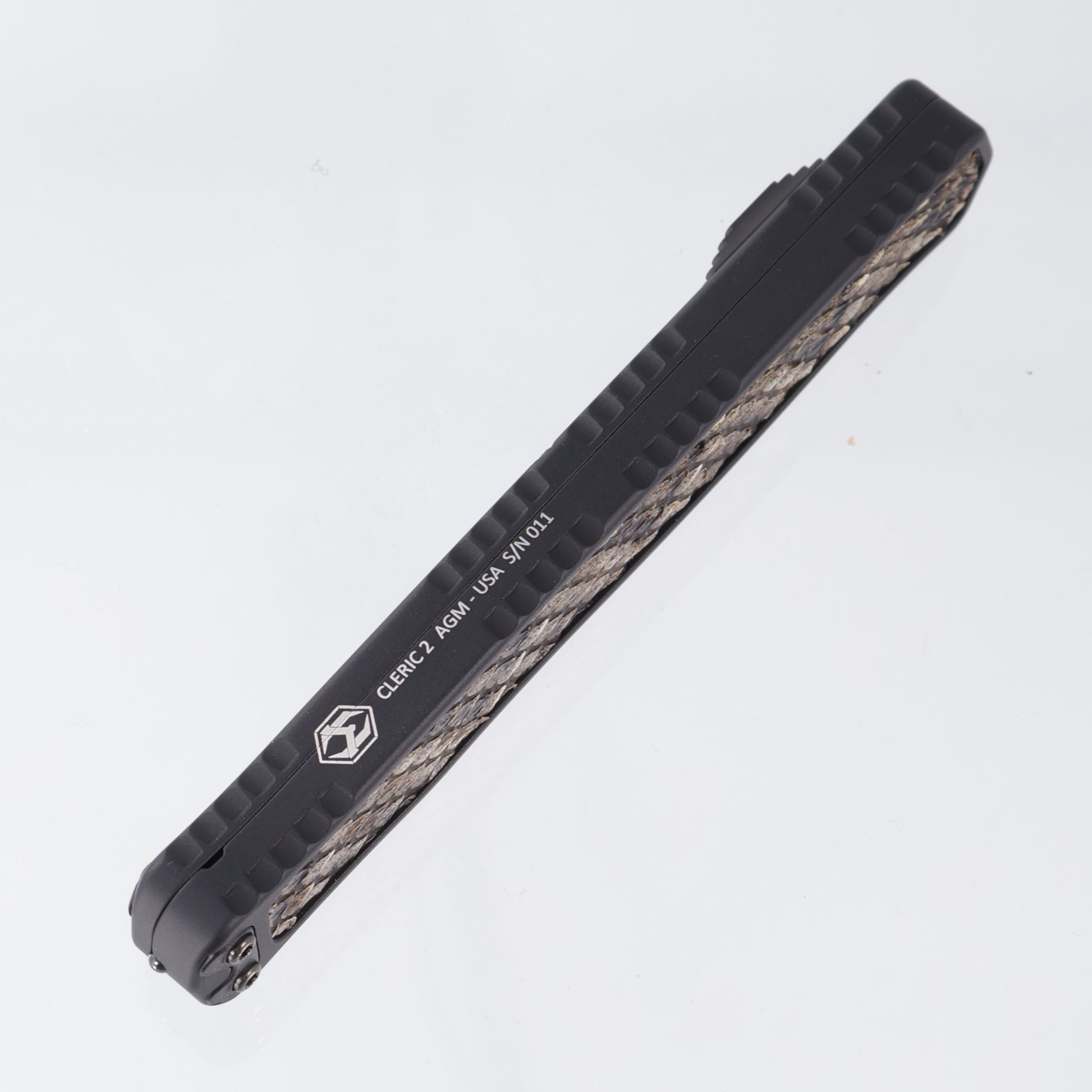 Cleric II Custom - Hand Ground High Sheen DLC - Aluminum Handle w/ Diamondback Rattlesnake inlays & Desert Ironwood button inlay