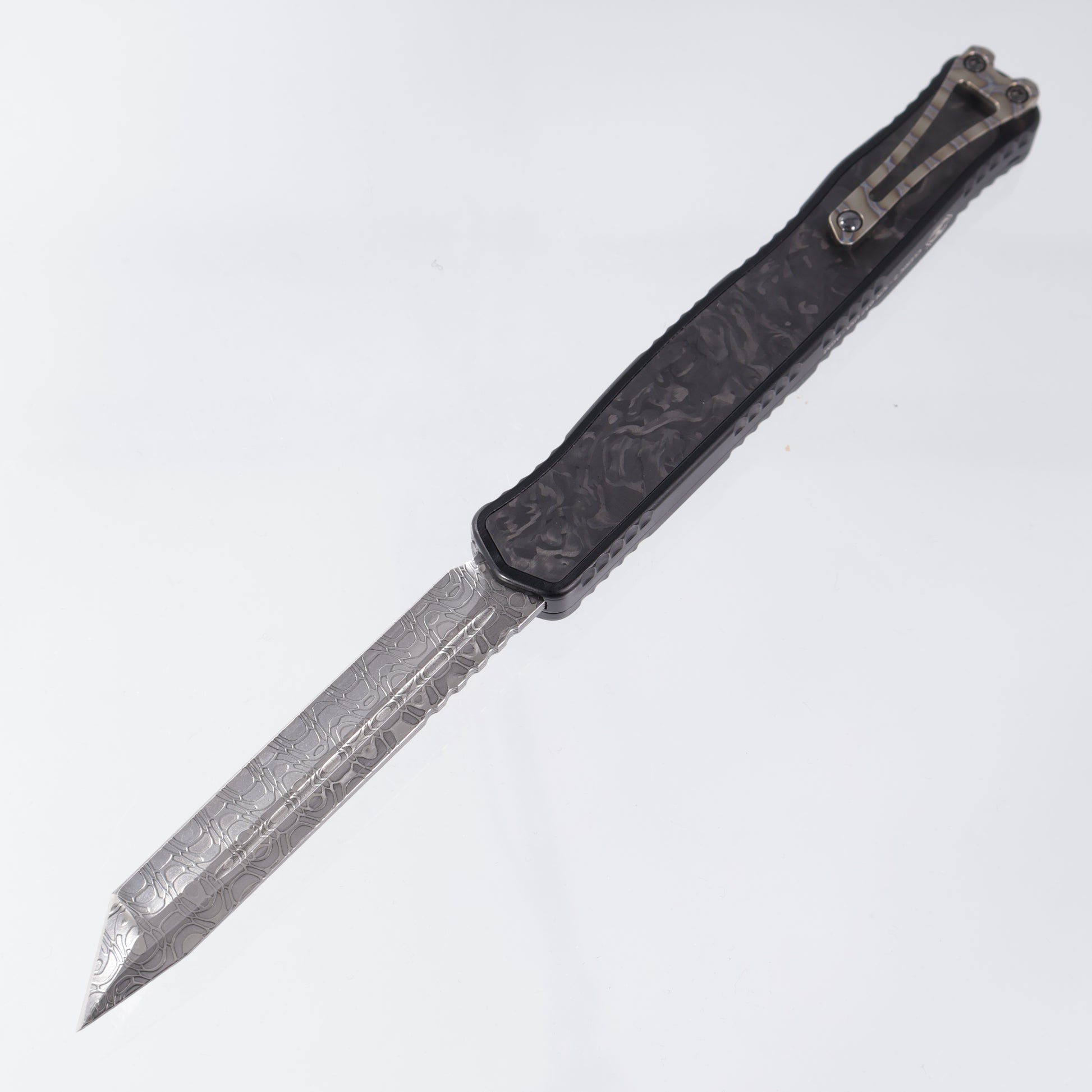 Heretic Cleric II Tanto Custom - Vegas Forge Razorwire Damascus - Aluminum Chassis w/ Marbled Carbon Fiber inlays, Flamed Ti button & Clip - S/N: 037 *PRE-OWNED*