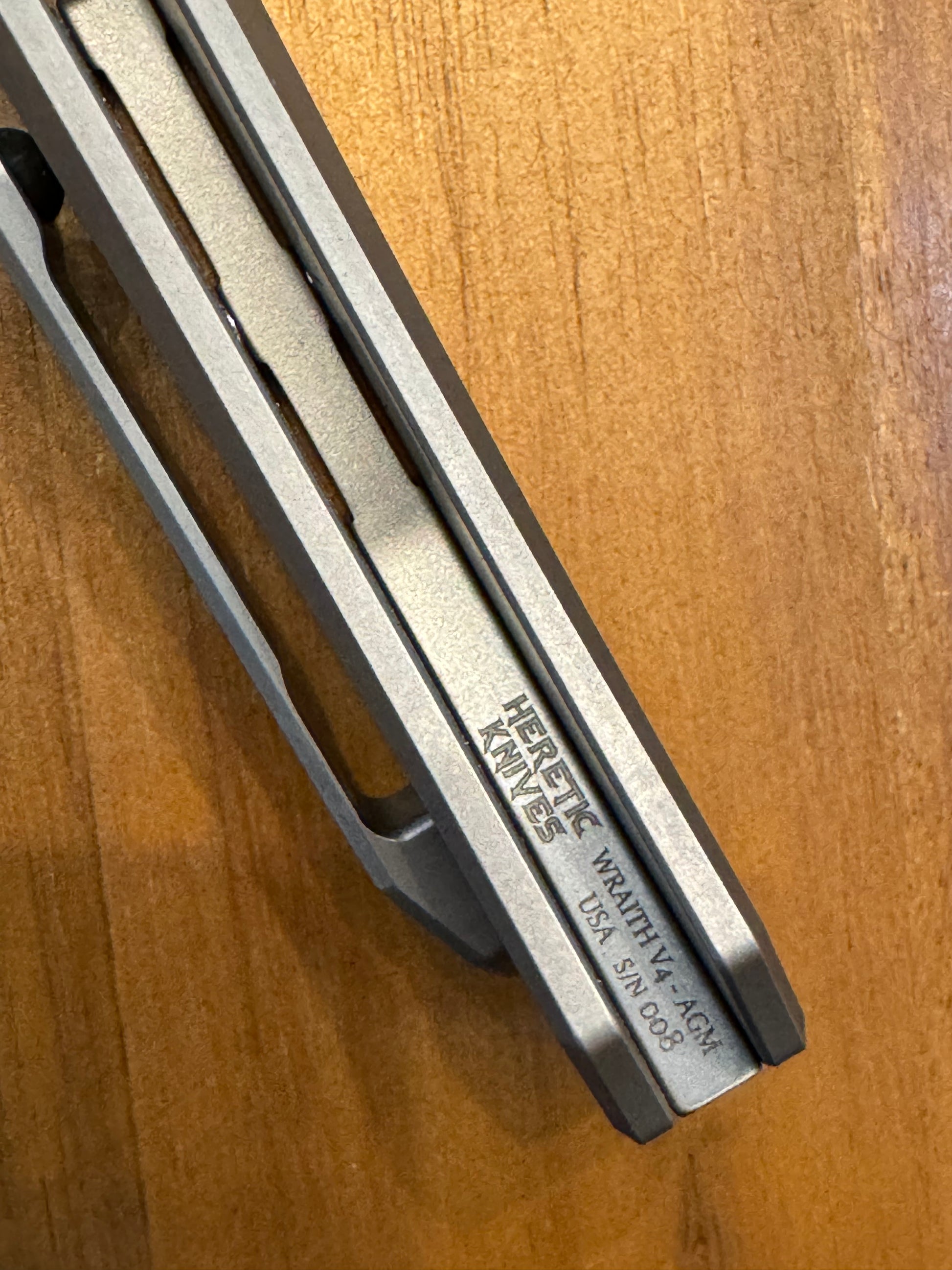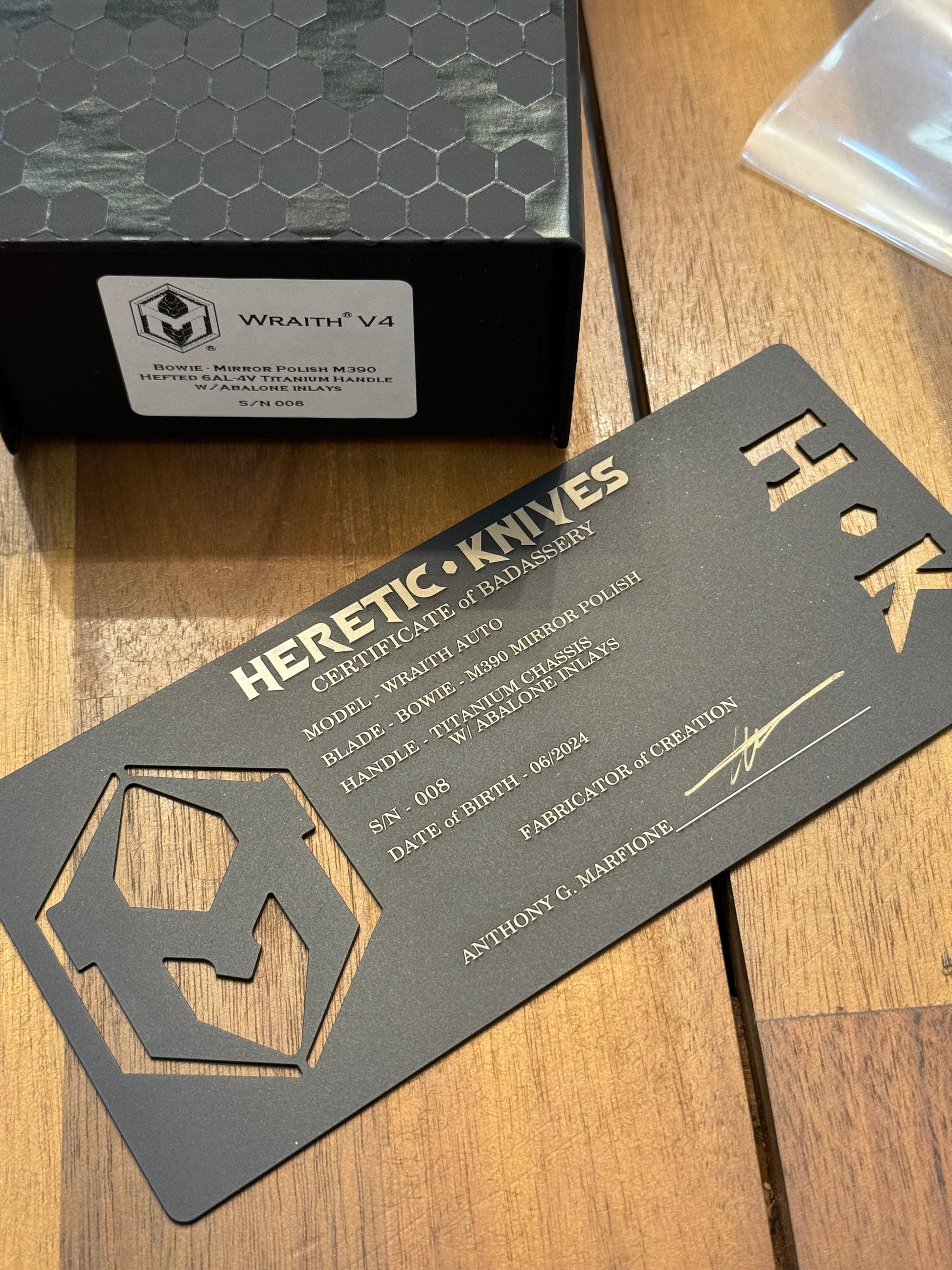 Heretic Custom V4 Wraith Bowie Mirror Polish M390 Hefted Titanium w Abalone Inlays