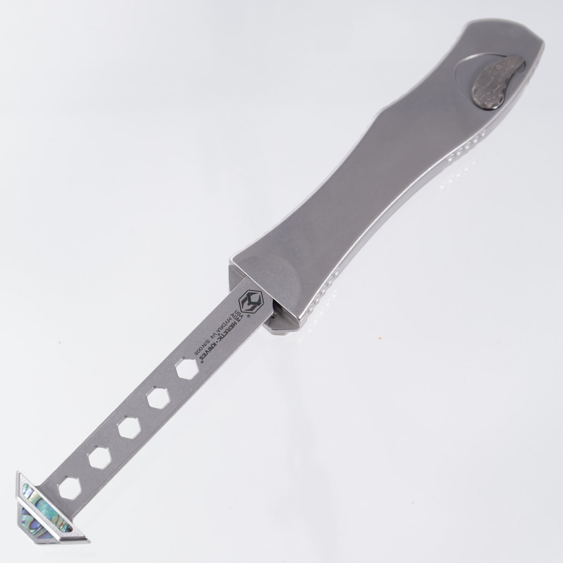 Heretic Hydra V4 Custom featuring a compound ground Vegas Forge San Mai Reptilian Damascus Tanto blade, Stainless Steel chassis w/ San Mai Reptilian button cover, Abalone Charging handle inlays, & Abalone button inlay! S/N: 008
