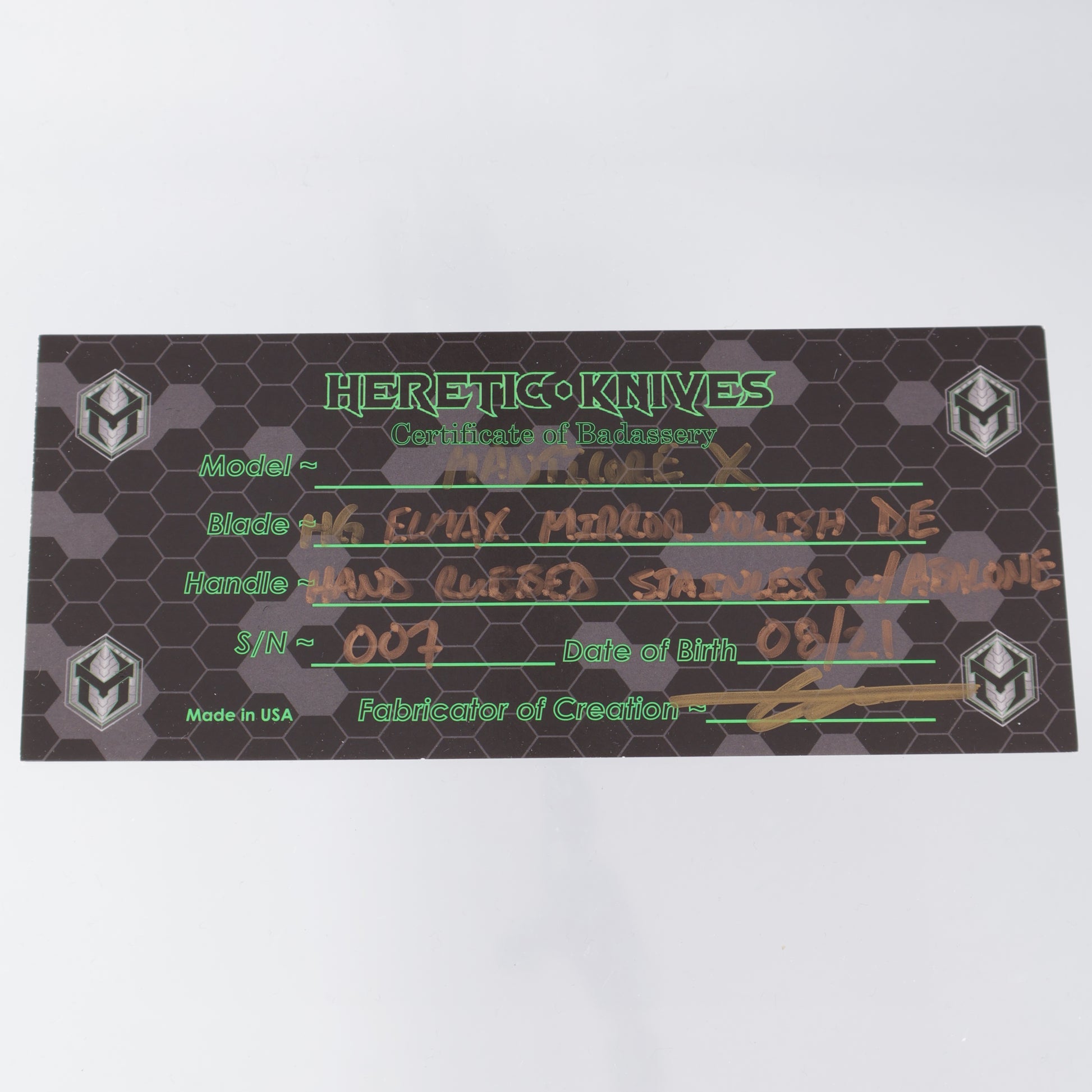 Heretic Manticore X Custom - Double Edge Mirror Polish Elmax Hand Ground - Stainless Chassis w/ Abalone Inlays - Ti Satin Clip - S/N 007 - Pre-Owned