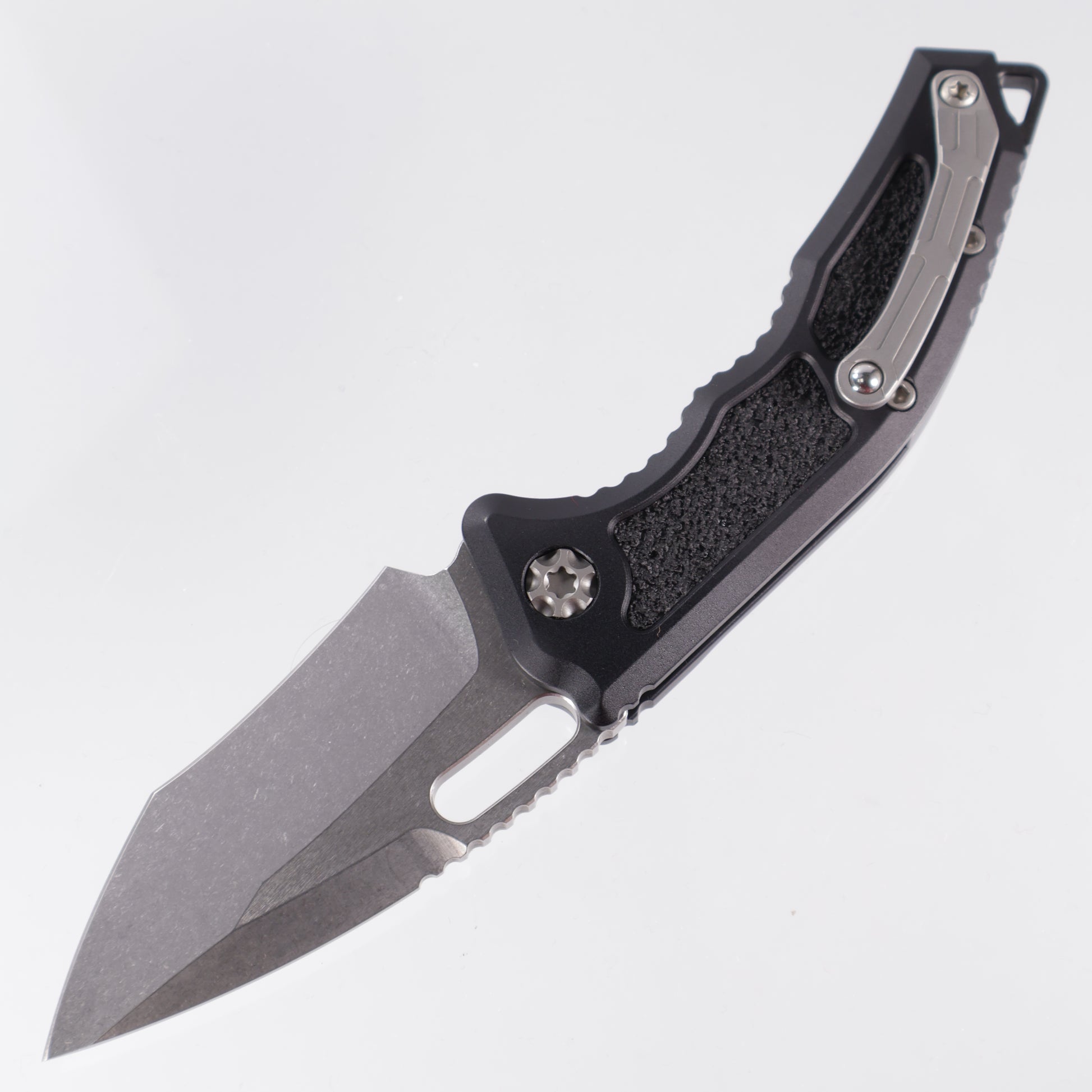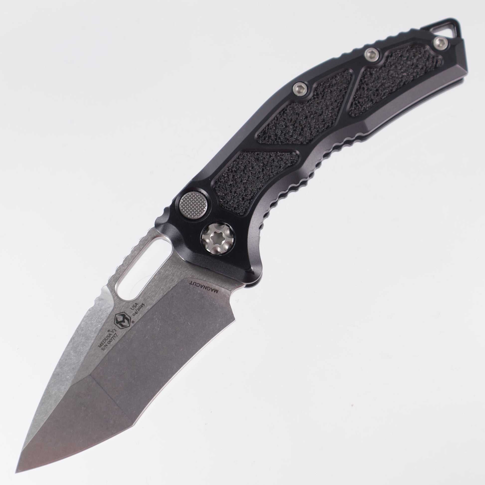 Heretic Medusa Auto - Recurve Tanto - Stonewash Magnacut - Aluminum & Black Traction Inlays - H012-2A