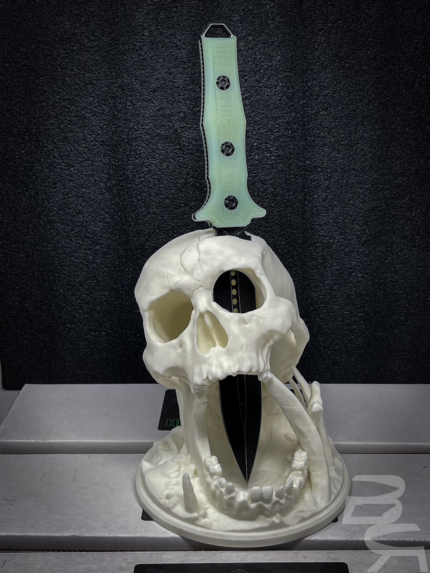 New Large Heretic Nephilim Double Edge Fixed Blade Dagger. This model features a Battleworn Black finished Elmax Steel blade. Jade Green G-10 Scales and Sheath as shown.