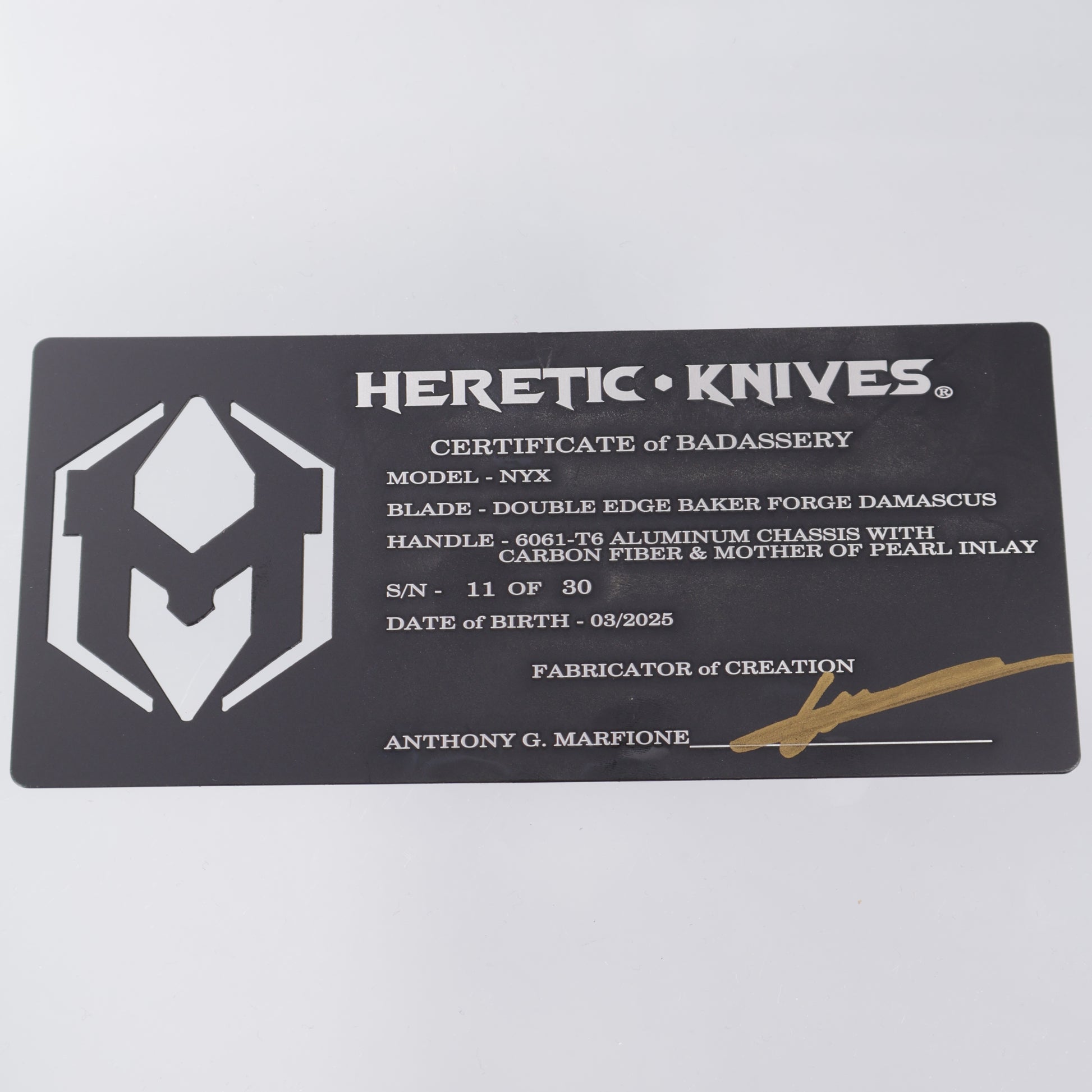 Heretic Nyx Custom - Double Edge Baker Forge Damascus - Aluminum Chassis w/ Carbon Fiber & Mother Of Pearl Inlays - Carbon Fiber Button w/ MOP Inlay - DLC Hardware