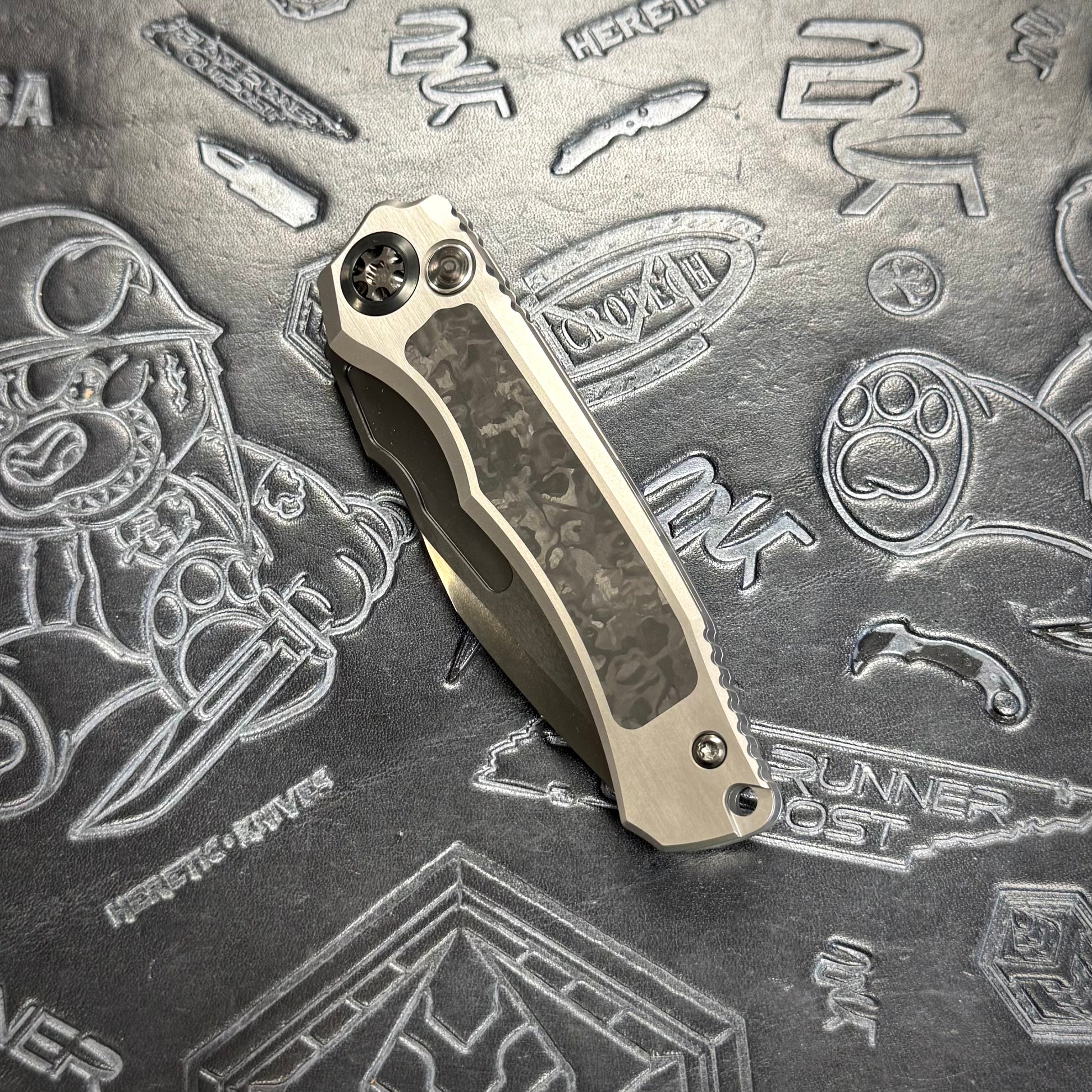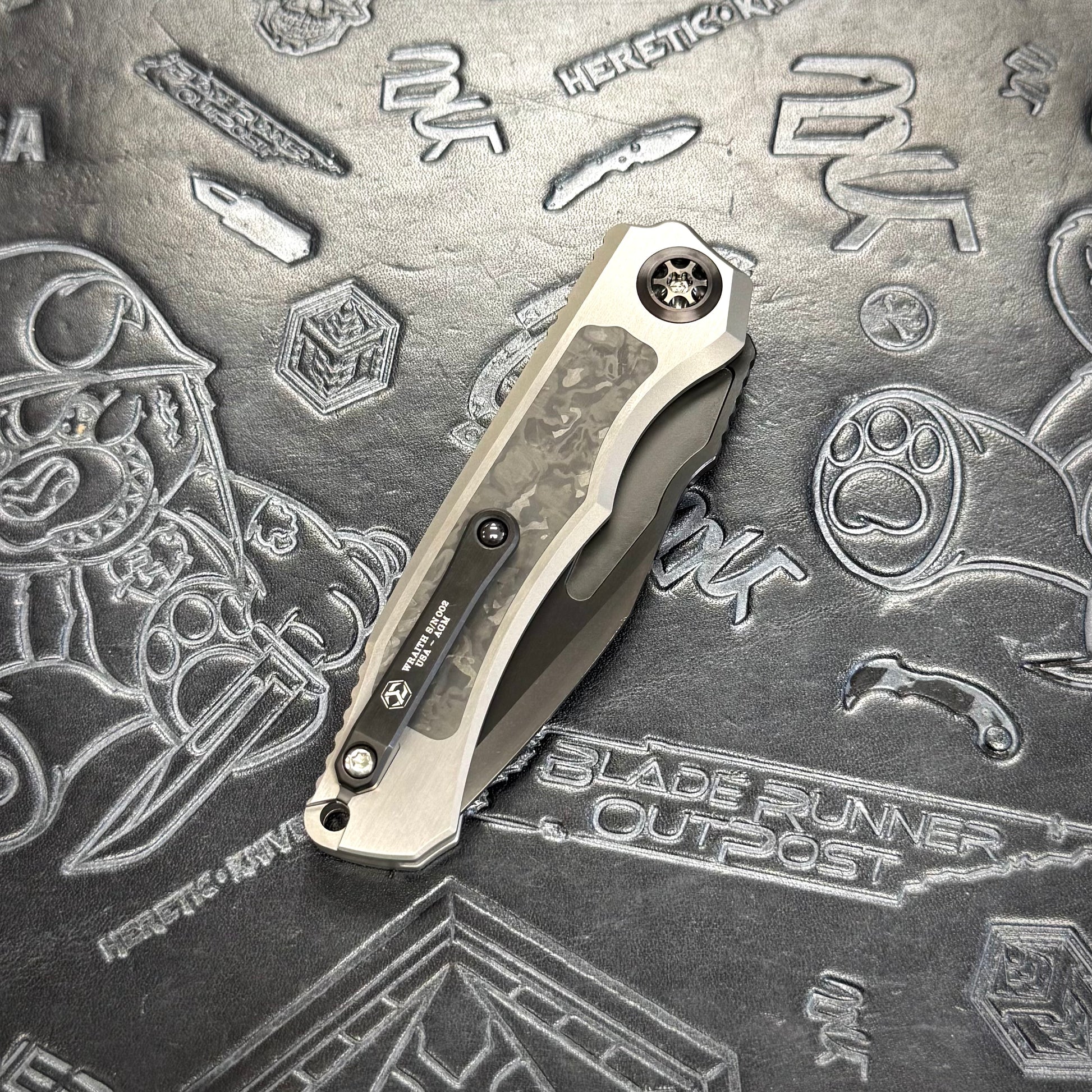 Heretic Wraith V4 Auto Custom featuring a compound ground high sheen DLC blade, hefted titanium chassis, CarboTi Techno Carbo Inlays & DLC Hardware! S/N: 002