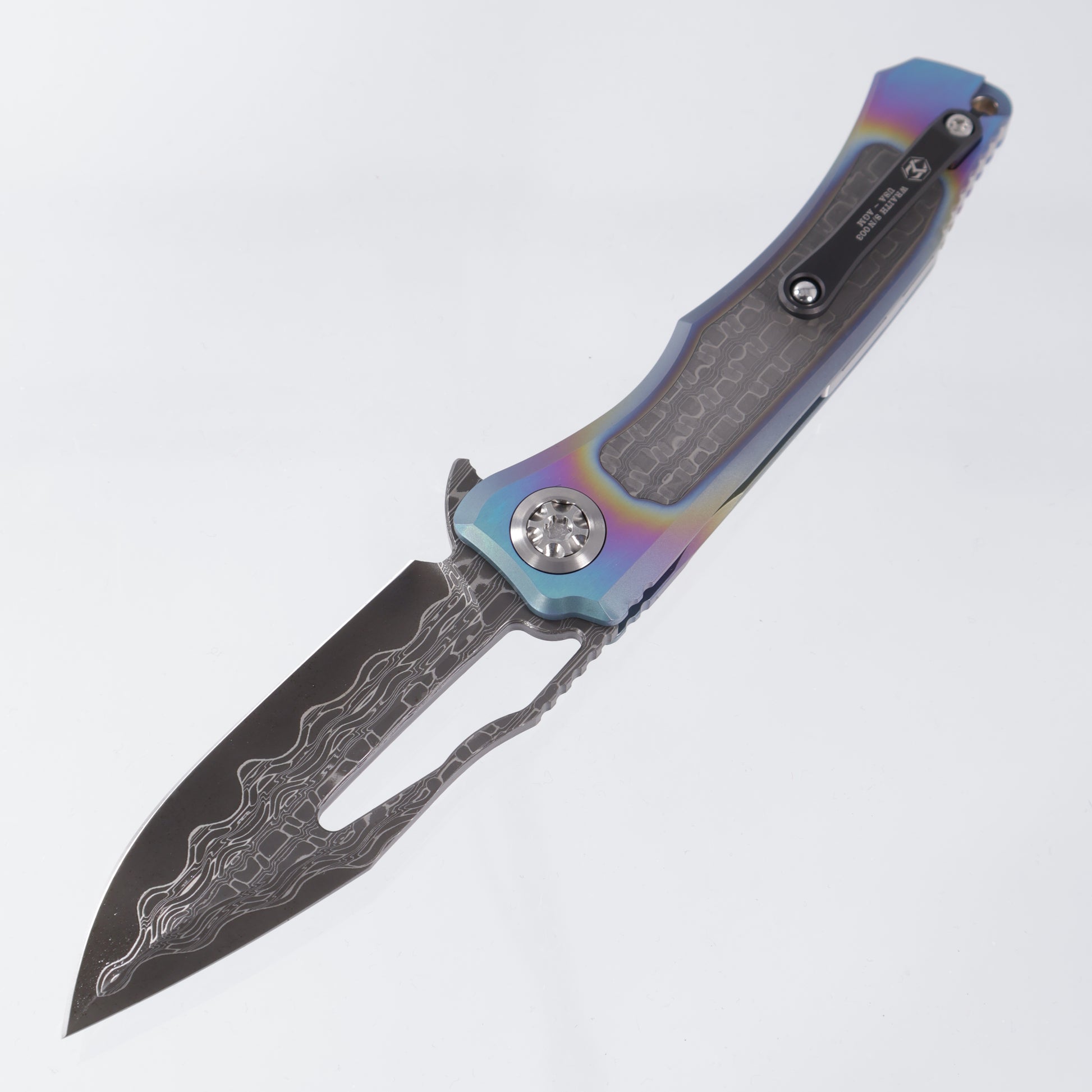 Heretic Wraith V4 Manual Custom featuring a hefted titanium chassis with Vegas Forge Reptilian pattern damascus inlays, an abalone button & a Vegas Forge Reptilian SanMai blade!