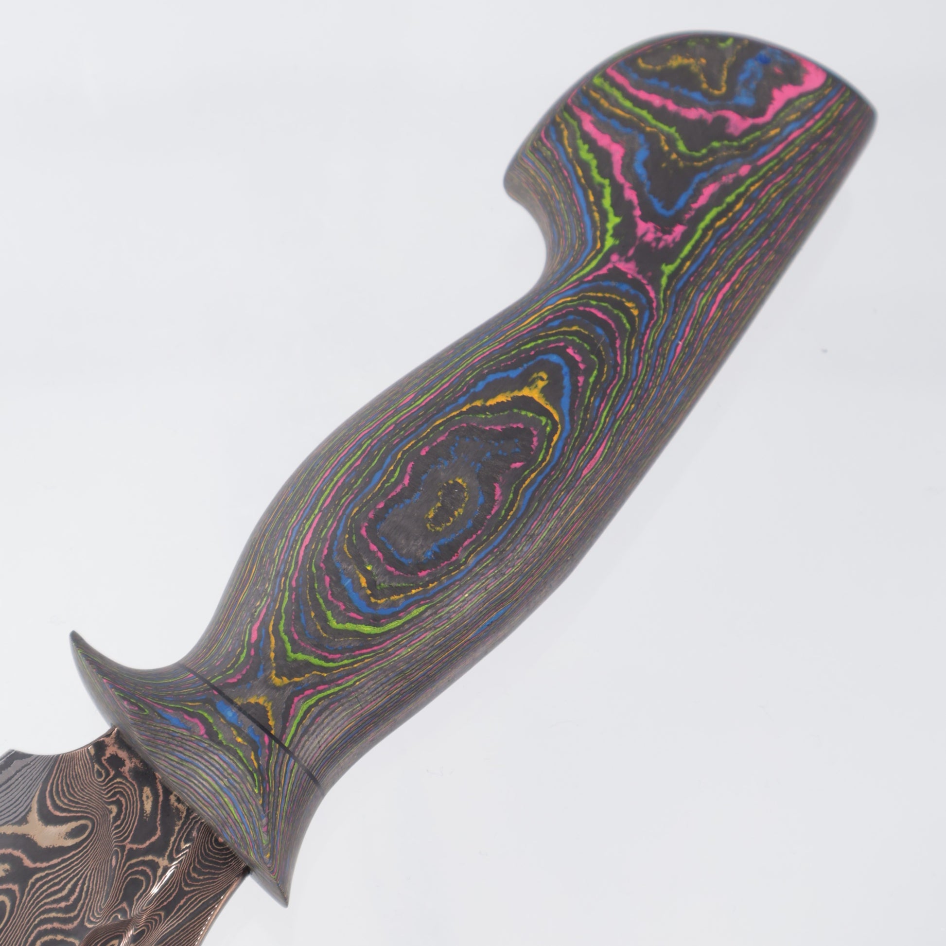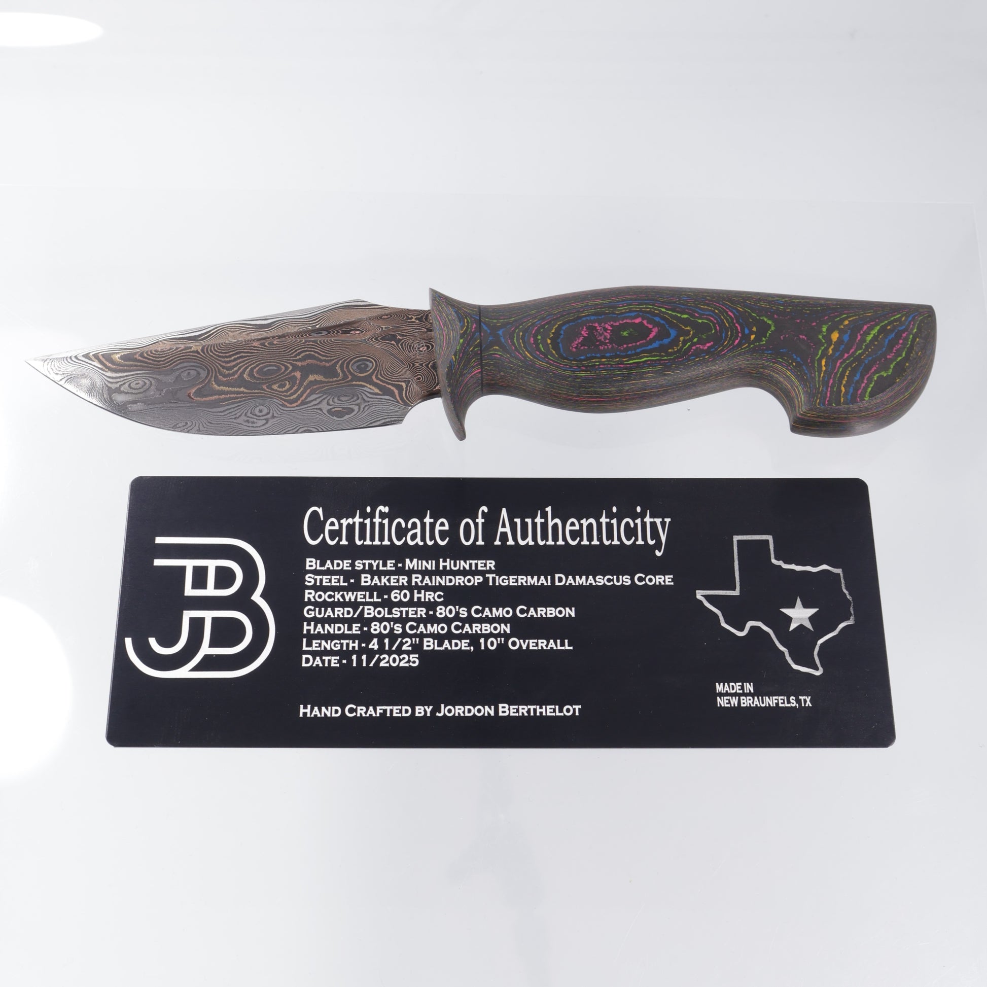 Jordon Berthelot Blades (JBB) Mini Hunter - Baker Forge Raindrop Tigermai Damascus Core - 80s Camo Carbon 1 Piece Handle - BR-OP Exclusive