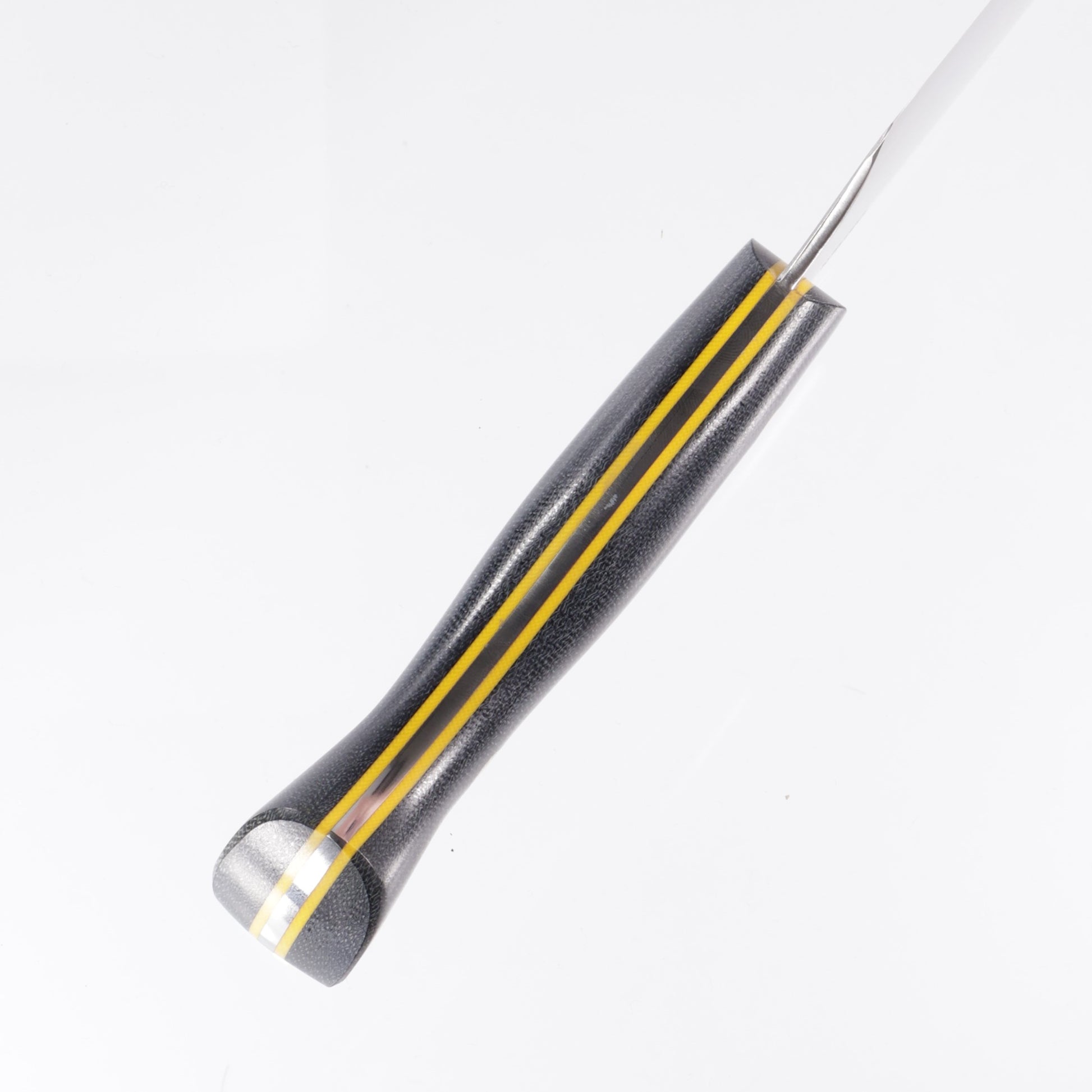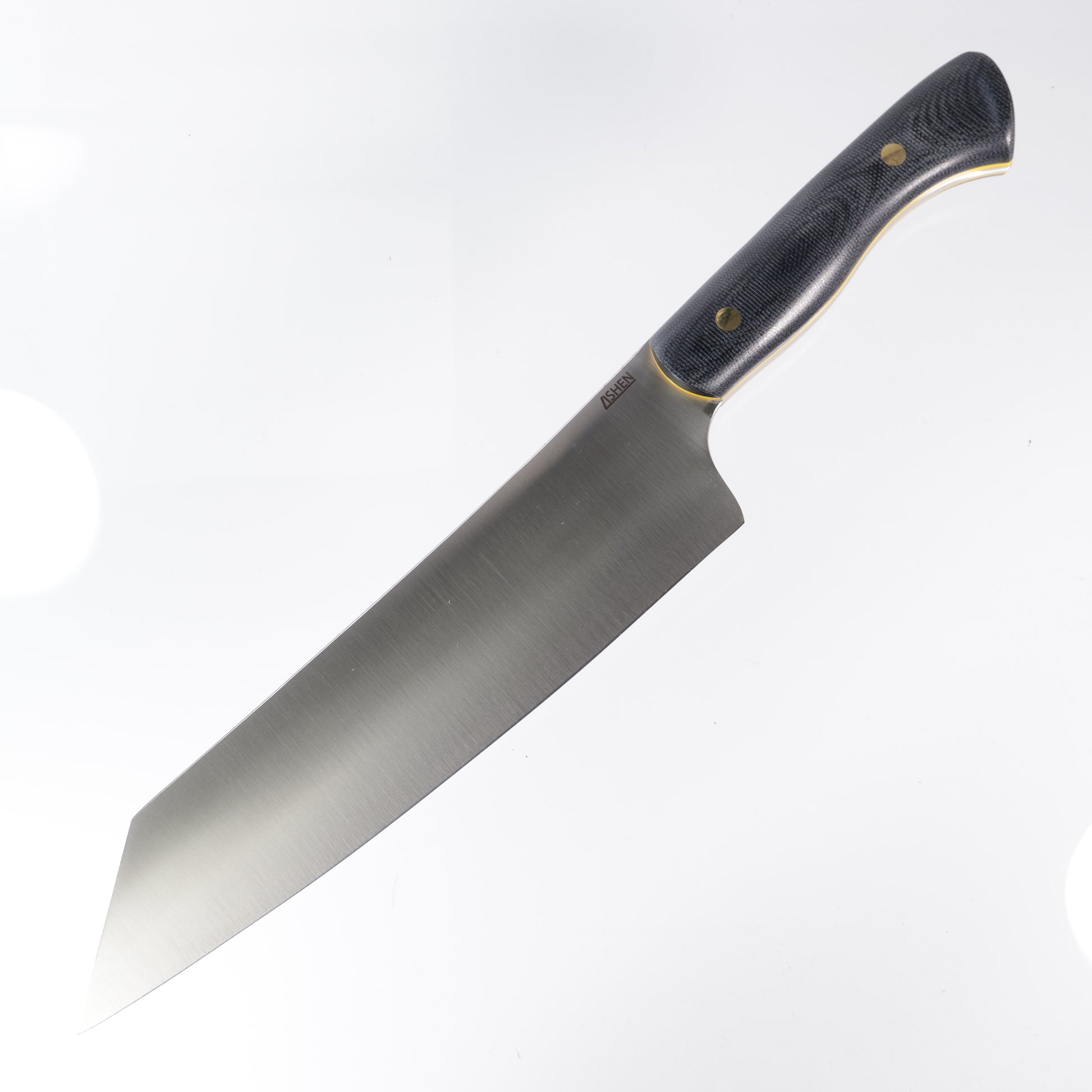 Lishen Knives Kiritsuke featuring a convex ground AEB-L blade, black canvas micarta handle scales w/ yellow liners, & Brass pins.