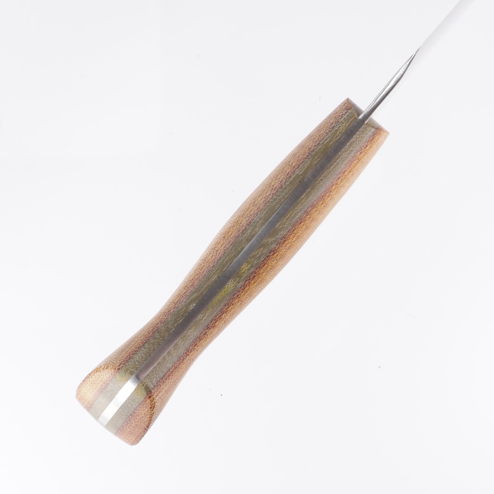 Lishen Knives Kiritsuke featuring a convex ground AEB-L blade, natural canvas micarta handle scales w/ thick green liners, & Brass pins.