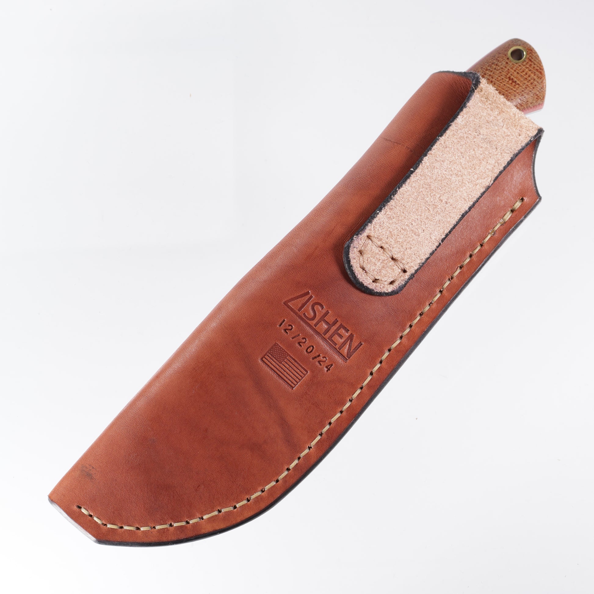 Lishen Knives Skinner featuring an AEB-L blade, natural canvas micarta handle scales w/ thick red liners & a leather belt carry sheath!