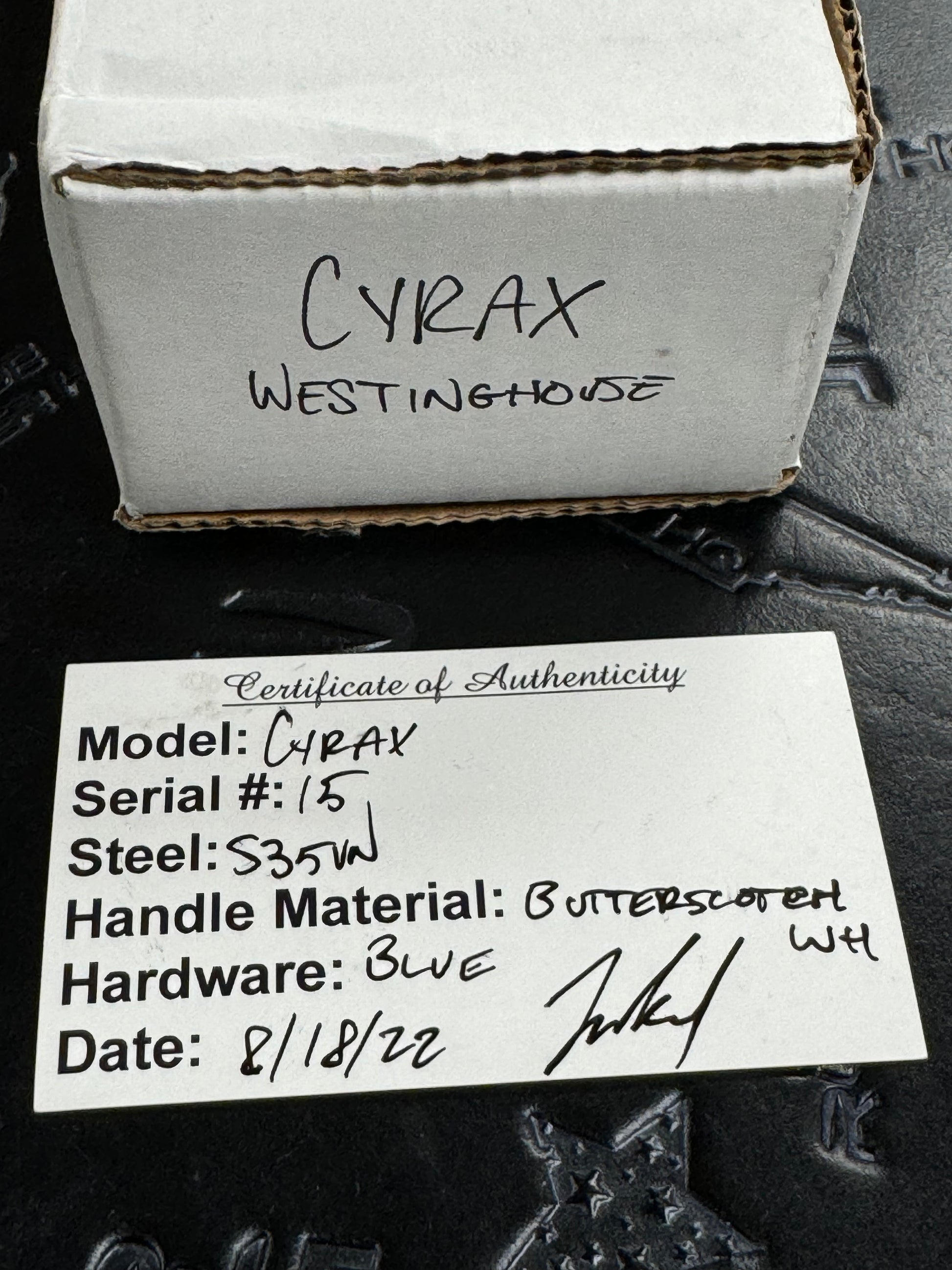 This Cyrax by Jake McCoy features an acid stonewashed blade with multi-grind, .137" blade stock and 1.155" blade depth, full tang construction with butterscotch Westinghouse canvas micarta scales and anodized titanium hardware. Comes with a kydex sheath, original box and COA dated 8/18/22. New from maker at the 2022 USN Gathering.