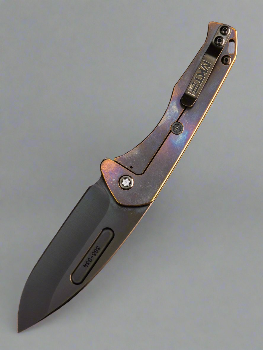4.25" (10.8cm) closed. 3.5" (8.89cm) black PVD coated S45VN stainless drop point blade. Bronze PVD coated titanium handle. Lanyard hole. Pocket clip. Extended tang. Glass breaker. Water tight case. Boxed.