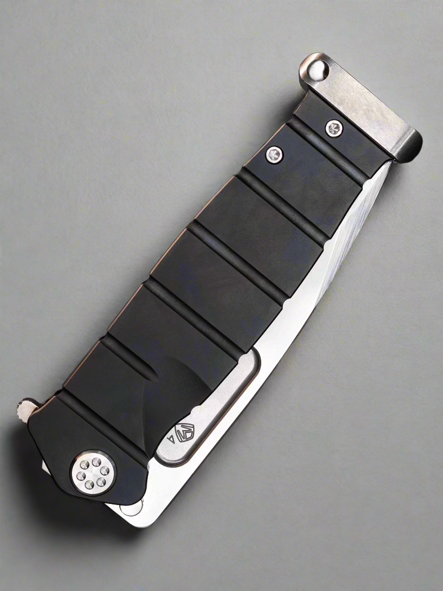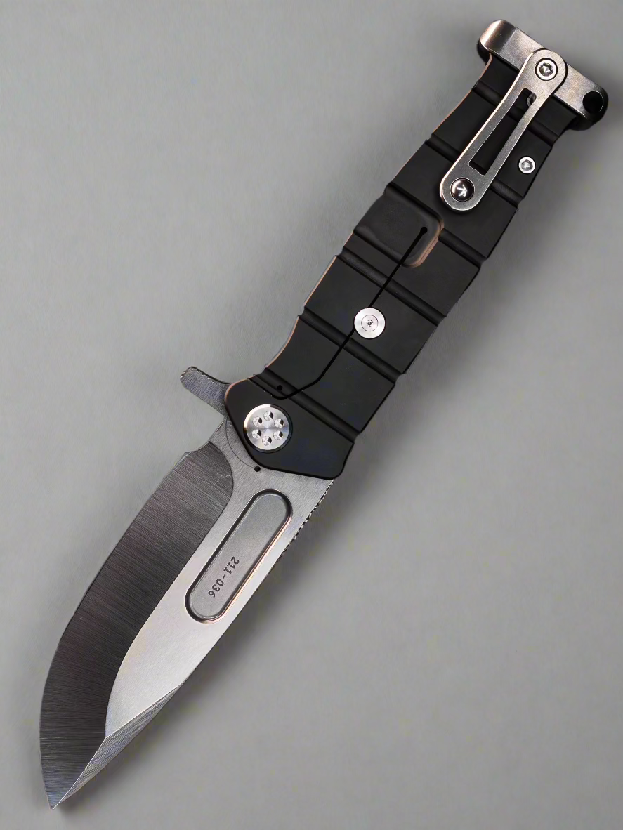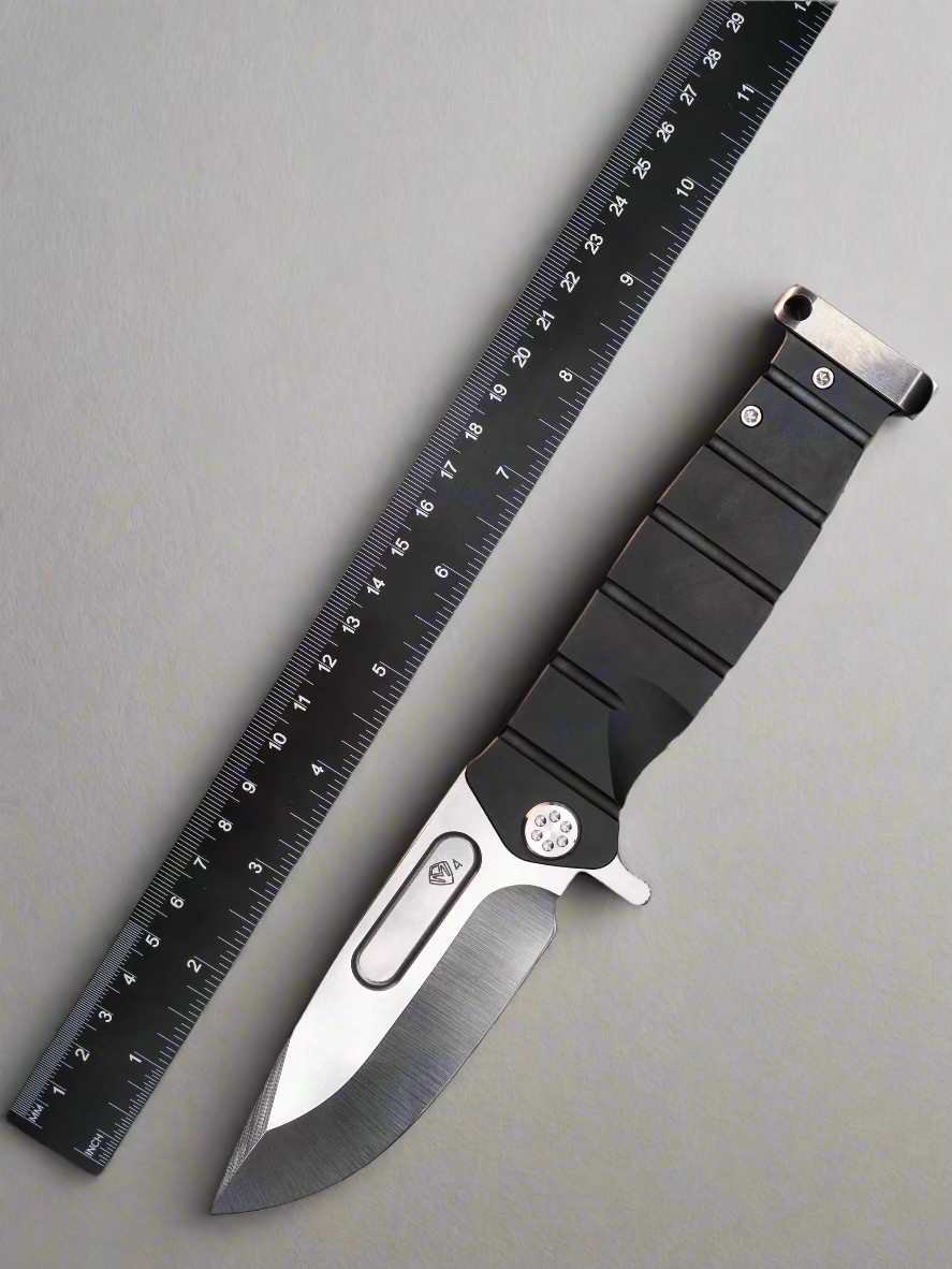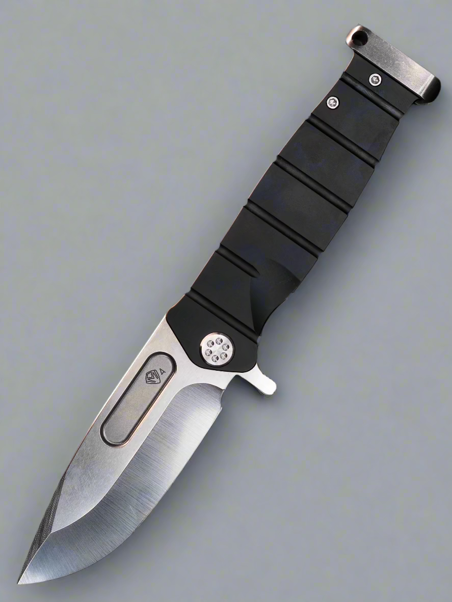 5.13" (13.03cm) closed. 4" (10.16cm) tumbled finish S45vn stainless drop point blade. Black PVD coated titanium handle. Extended tang. Lanyard hole. Thumb stud. Water tight case. Boxed.