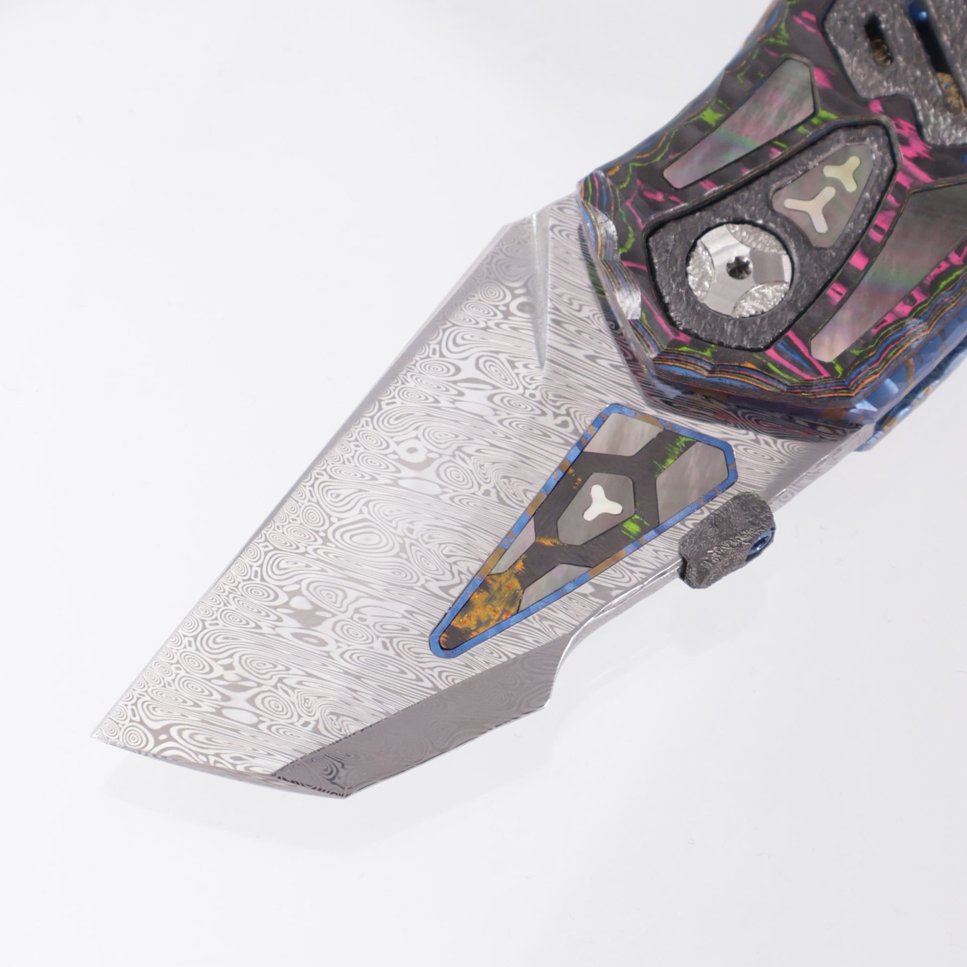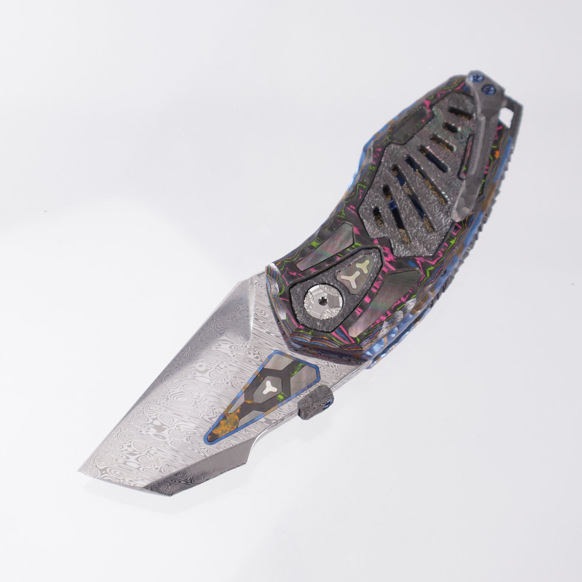 Manuele Messori Tank Custom - Damasteel Bifrost - 80s Camo Carbon Scales - Zirconium / Black Lip Pearl Interframe - Anodized Titanium Internal Scales - BROP Exclusive