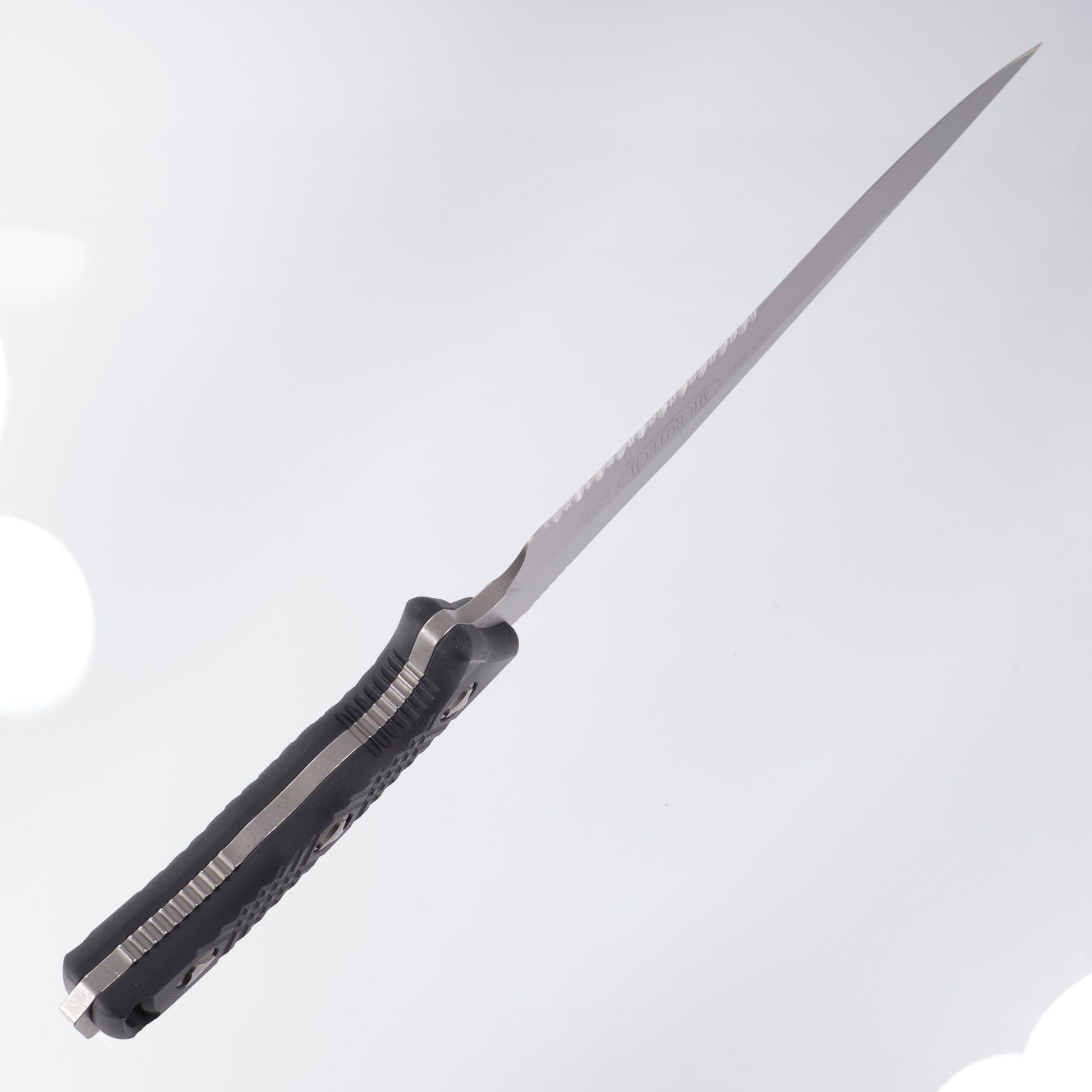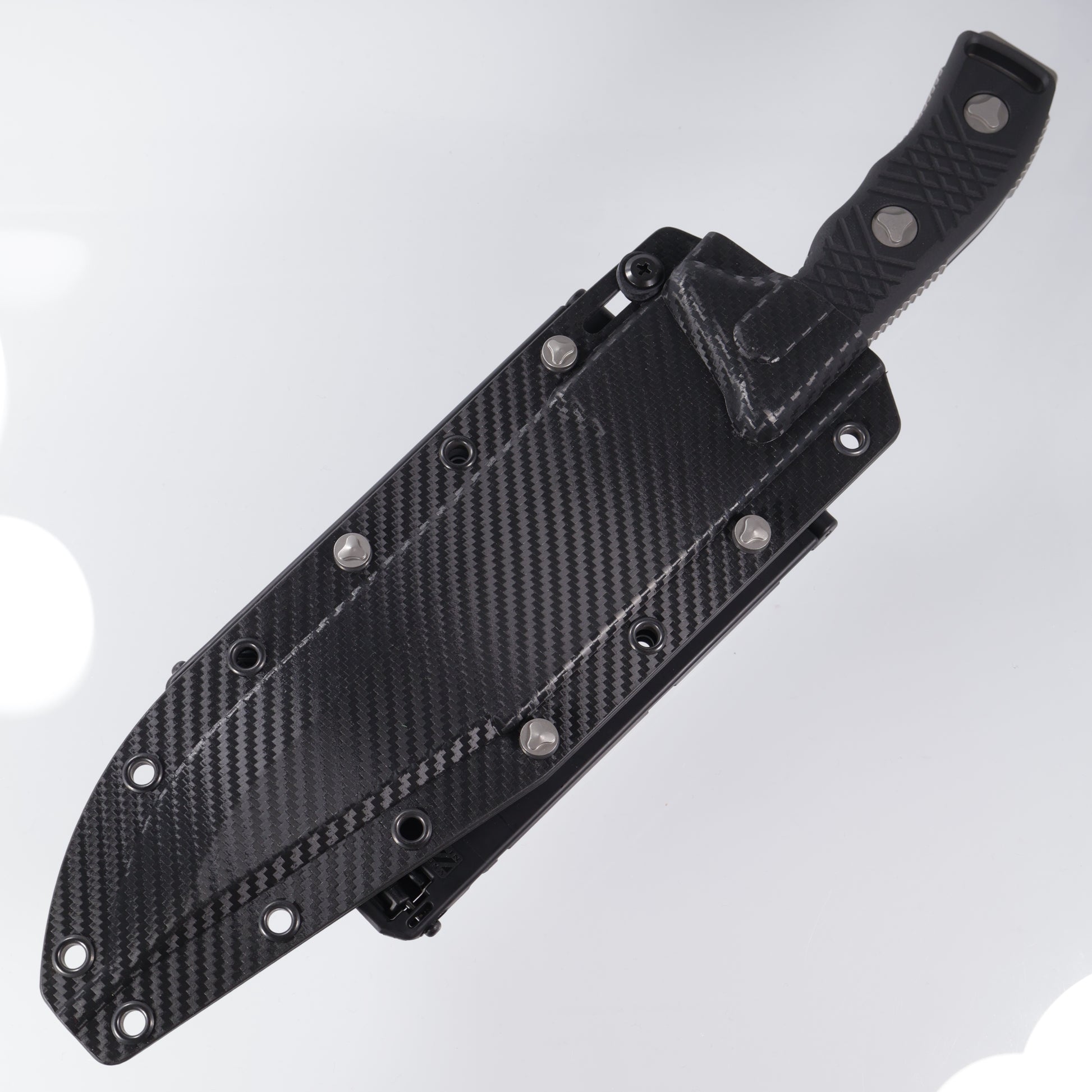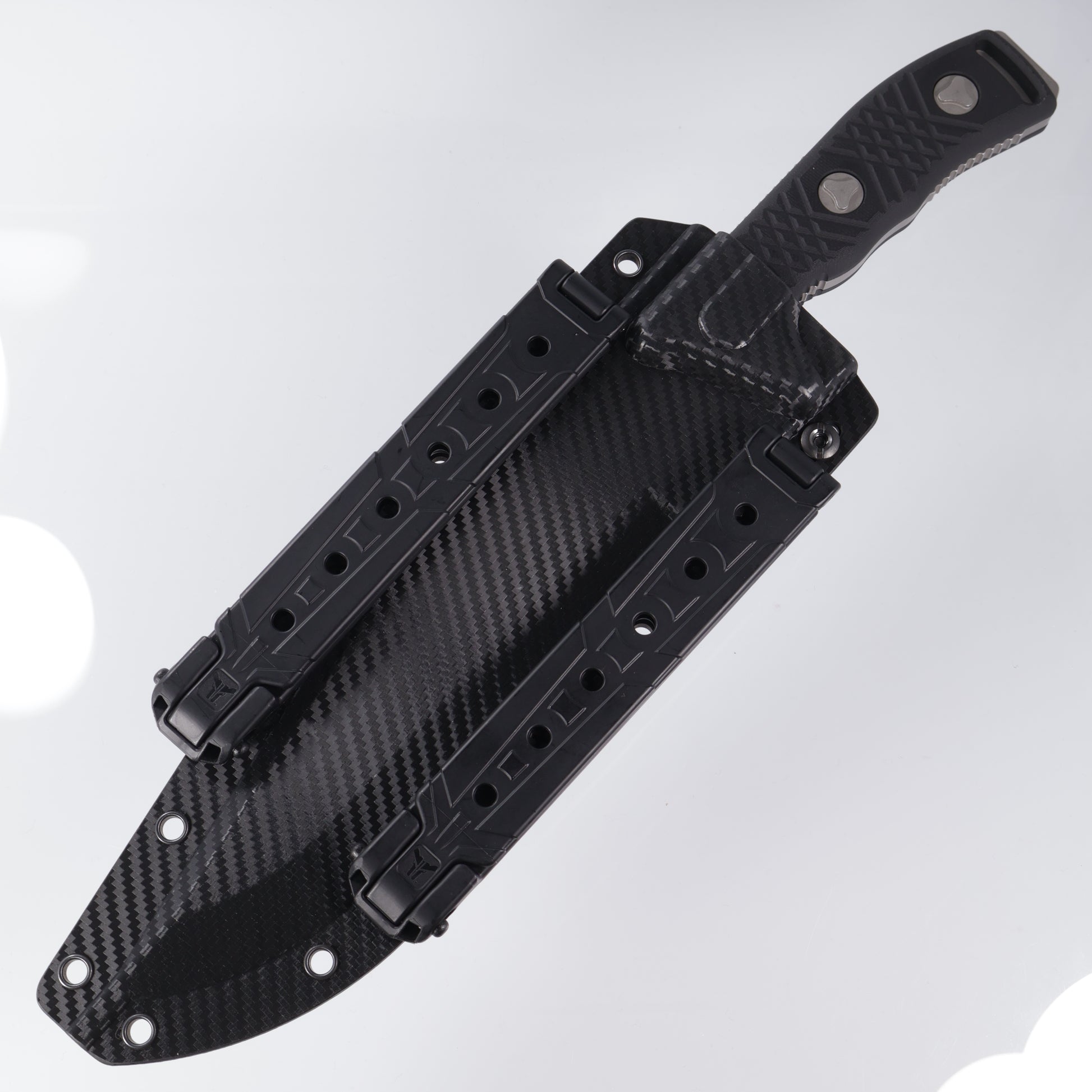 The concept for the Arbiter was originally drafted by Adam Marfione back in 2012. Microtech was excited to bring this piece to production as Adam began stepping up as a more integral part of their team at that time. Previously only available as a custom knife, the Arbiter features a clip point bowie style blade with an elegant recurved primary cutting edge and a secondary upper cutting edge. Both converge to an upswept tip with devastating penetrating power. The scales feature a crisscross patterned texture and grooves along the edge of the handle which offers an impressive grip, creating perfect harmony between user and instrument. The Arbiter comes with a molded Kydex sheath and MOLLE Clips.