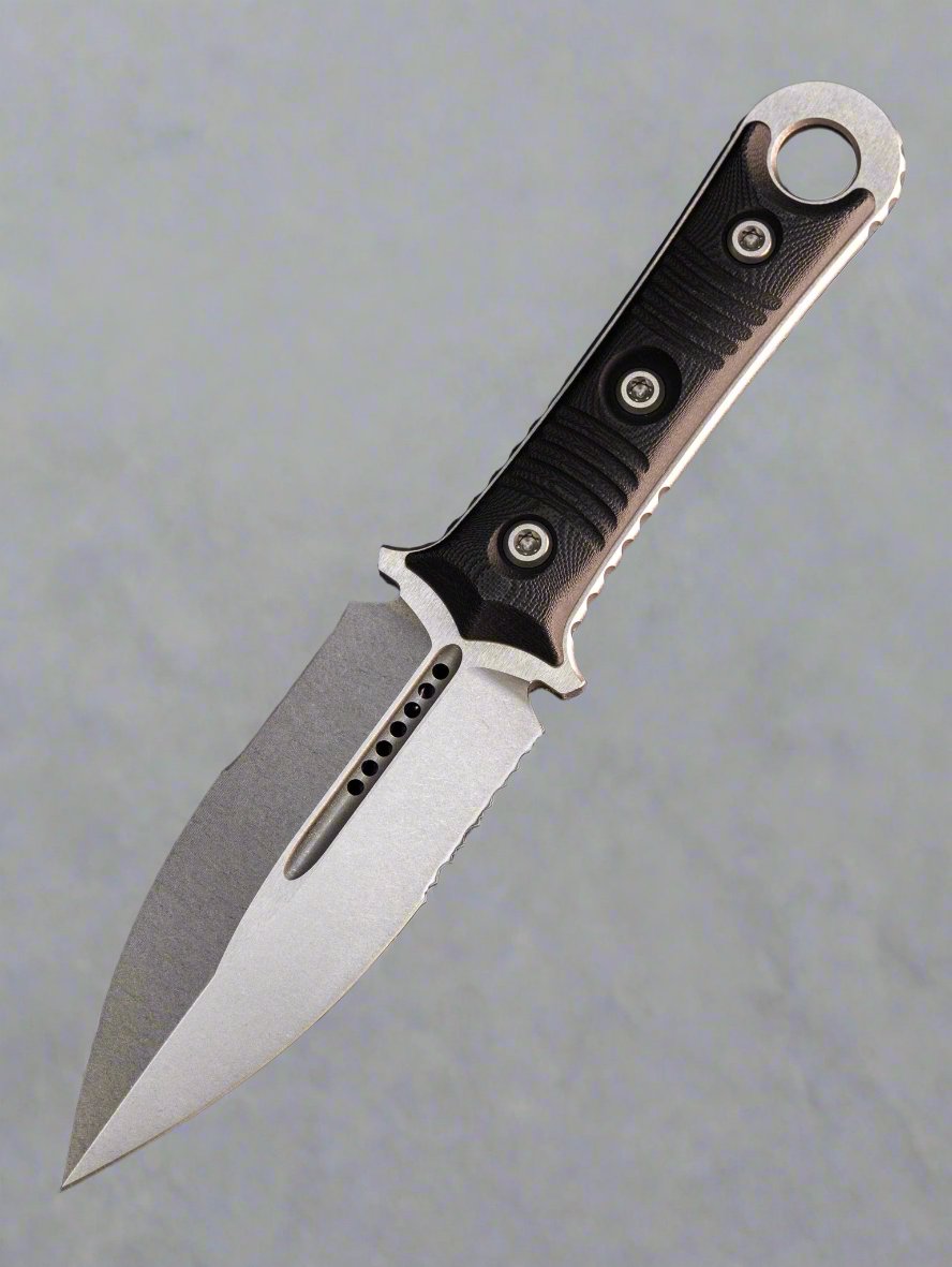 Microtech/Borka Blades 201-11 SBD Fixed Blade Knife 4.375" Stonewashed Double Combo Edge Dagger Blade, Milled Black G10 Handles, Kydex Sheath