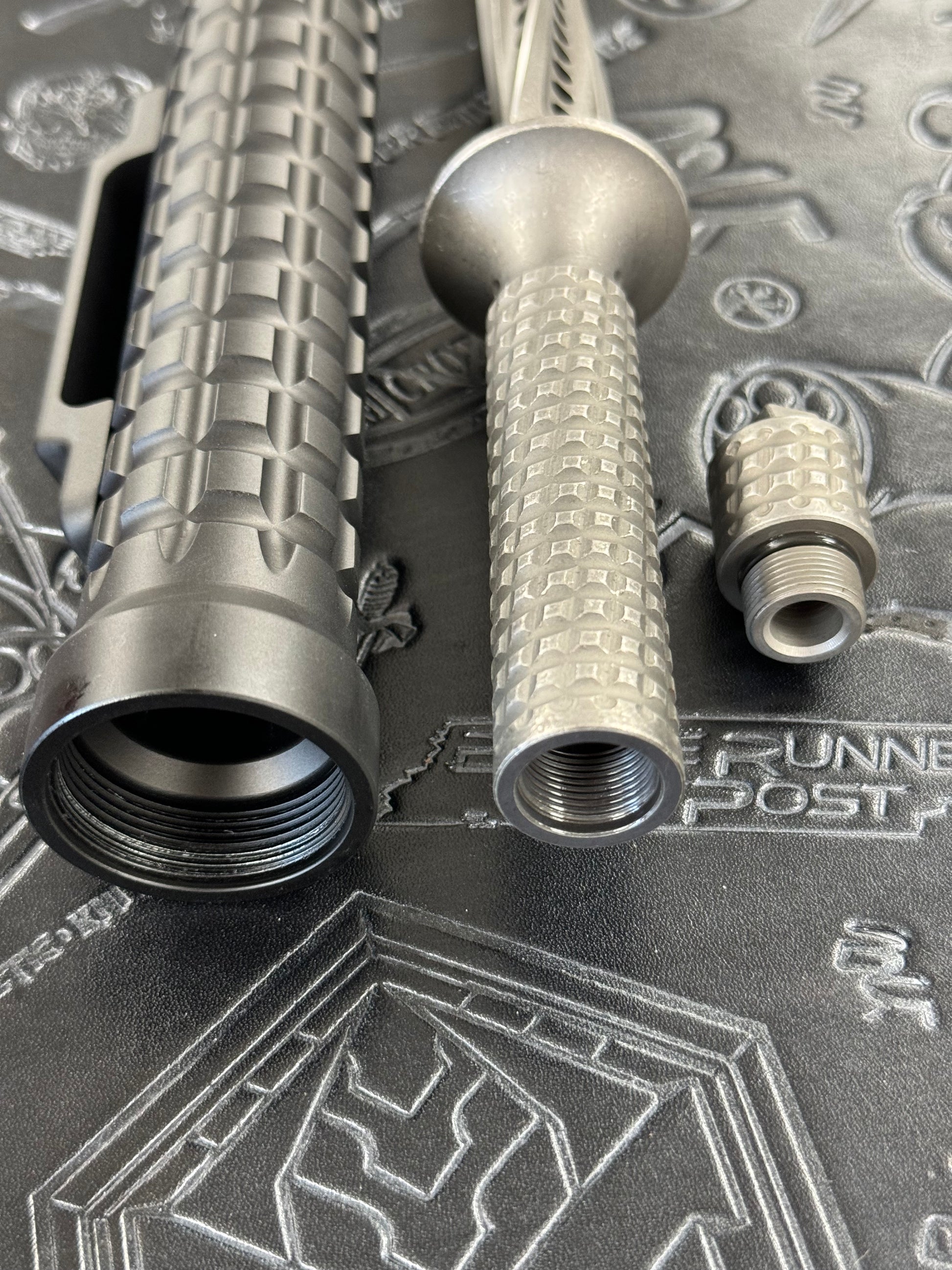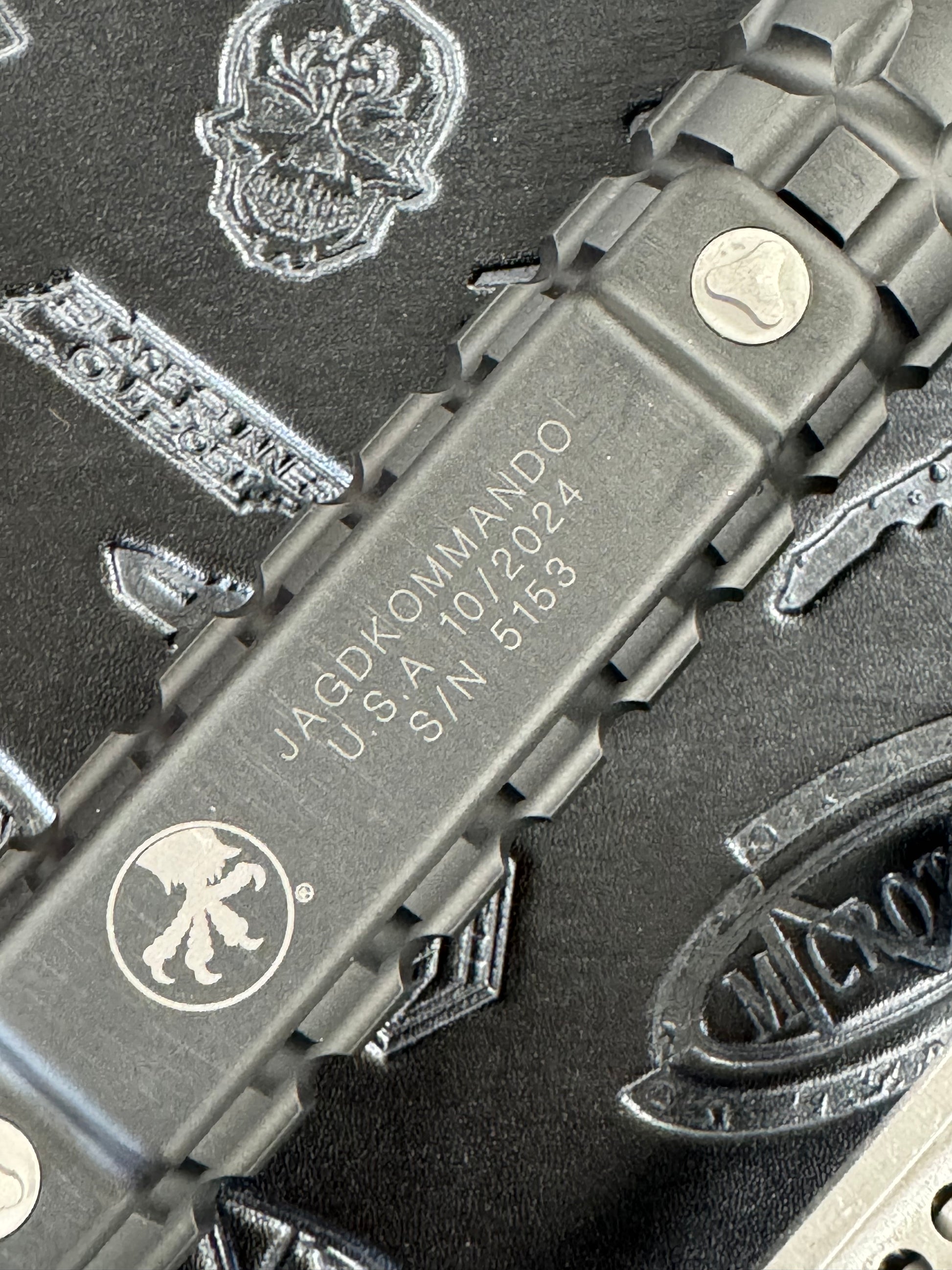 Crafted from solid billet, the machining behind the Jagdkommando™ (German for mountain hunter) is highly impressive. Starting at the hollowed handle and watertight top, the machined grenade pattern of the handle transitions seamlessly into the three-edged blade, finally twisting to a deadly point. The Jagdkommando™ is paired with a custom hard-coated 6061 T6 tubular sheath with a matching machined grenade pattern and watertight seal.