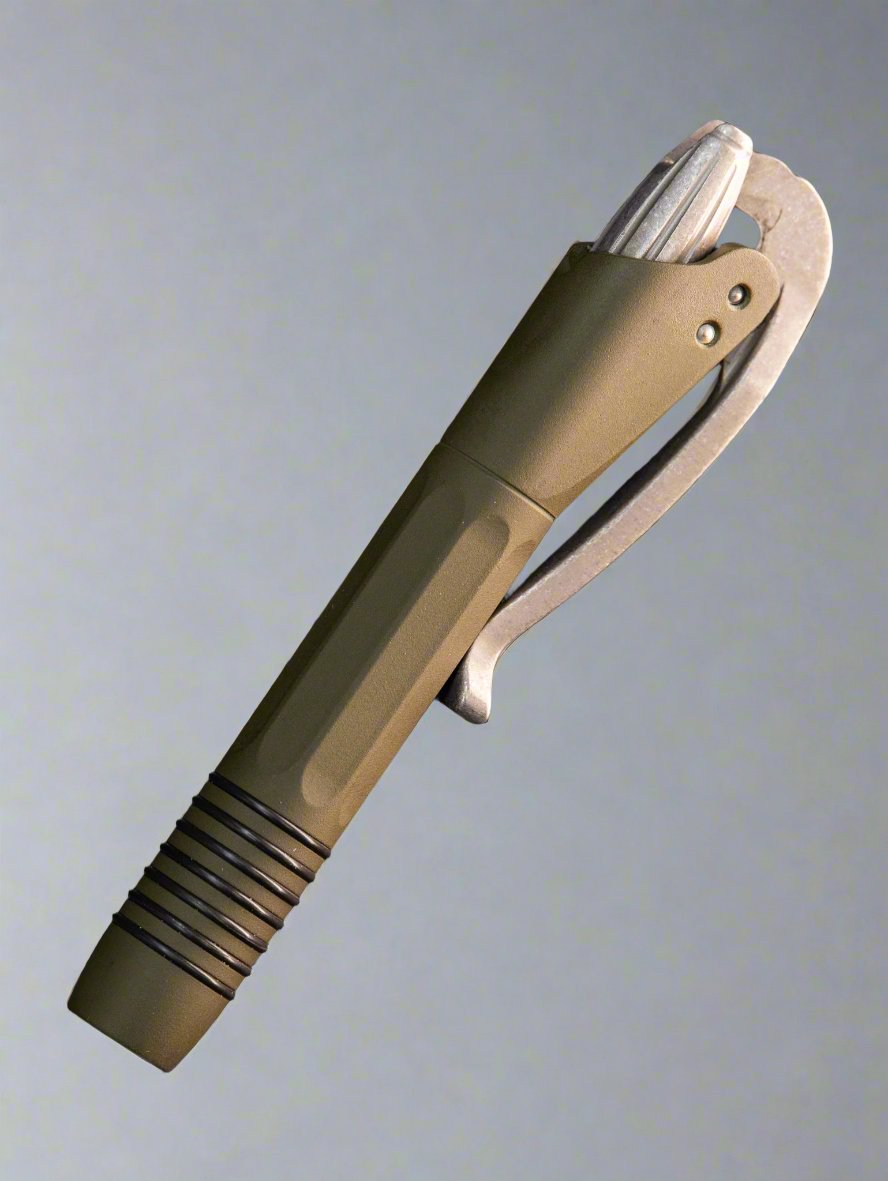 Microtech's unique lever action pen with pocket clip.It measures 3.9" with lever folded down and writing tip retracted.