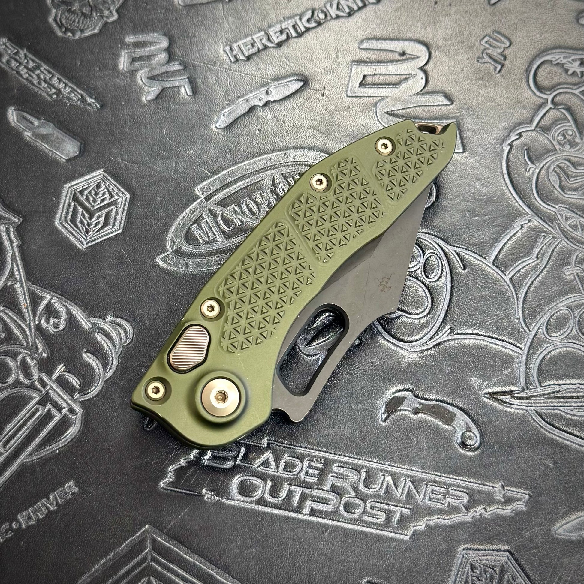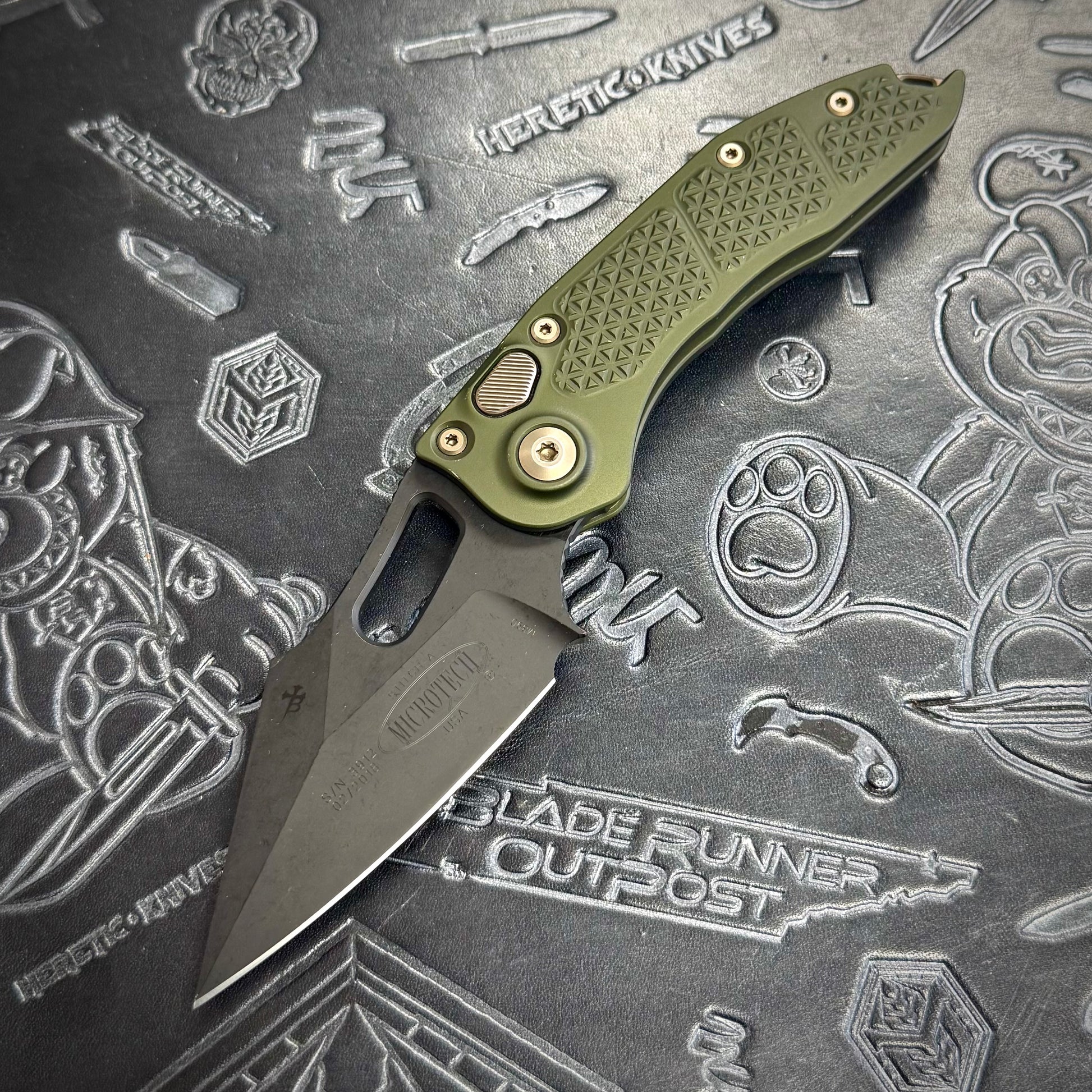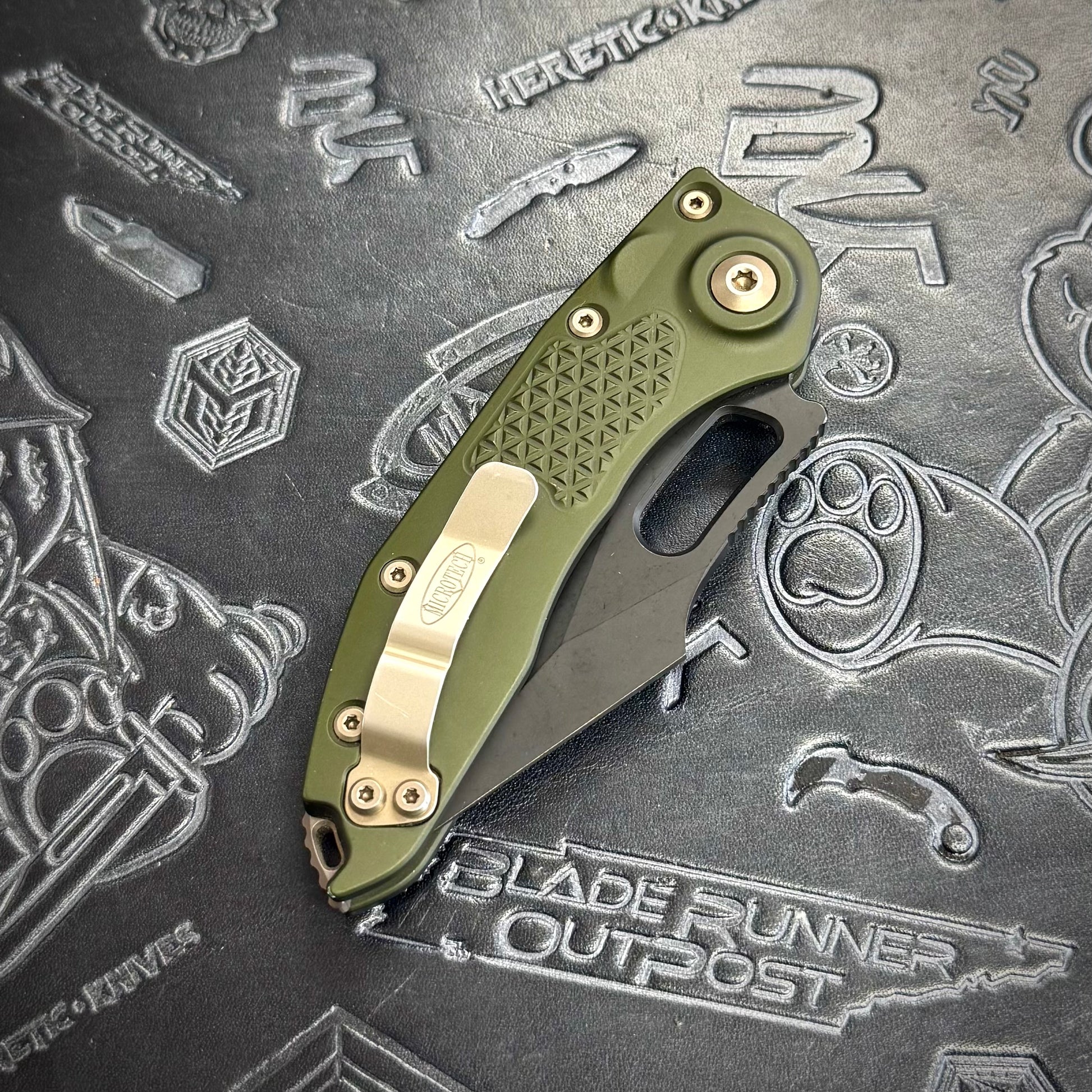 Microtech Stitch Auto featuring OD Green anodized handle scales, DLC blade & bronze hardware. Very Rare configuration from what we understand.
