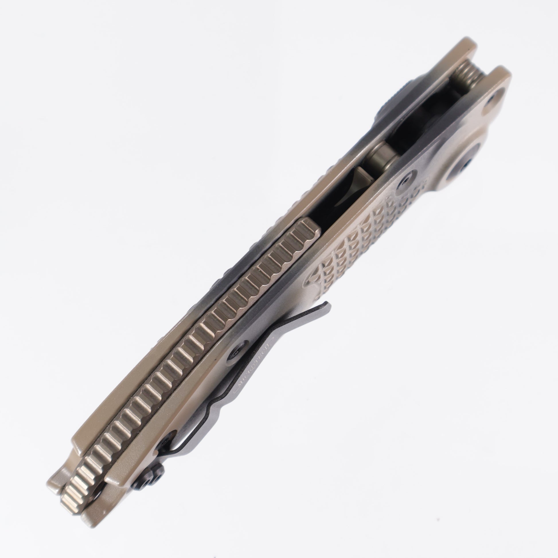 Microtech Stitch Auto featuring full tan camo cerakote, black hardware & bronze accents.