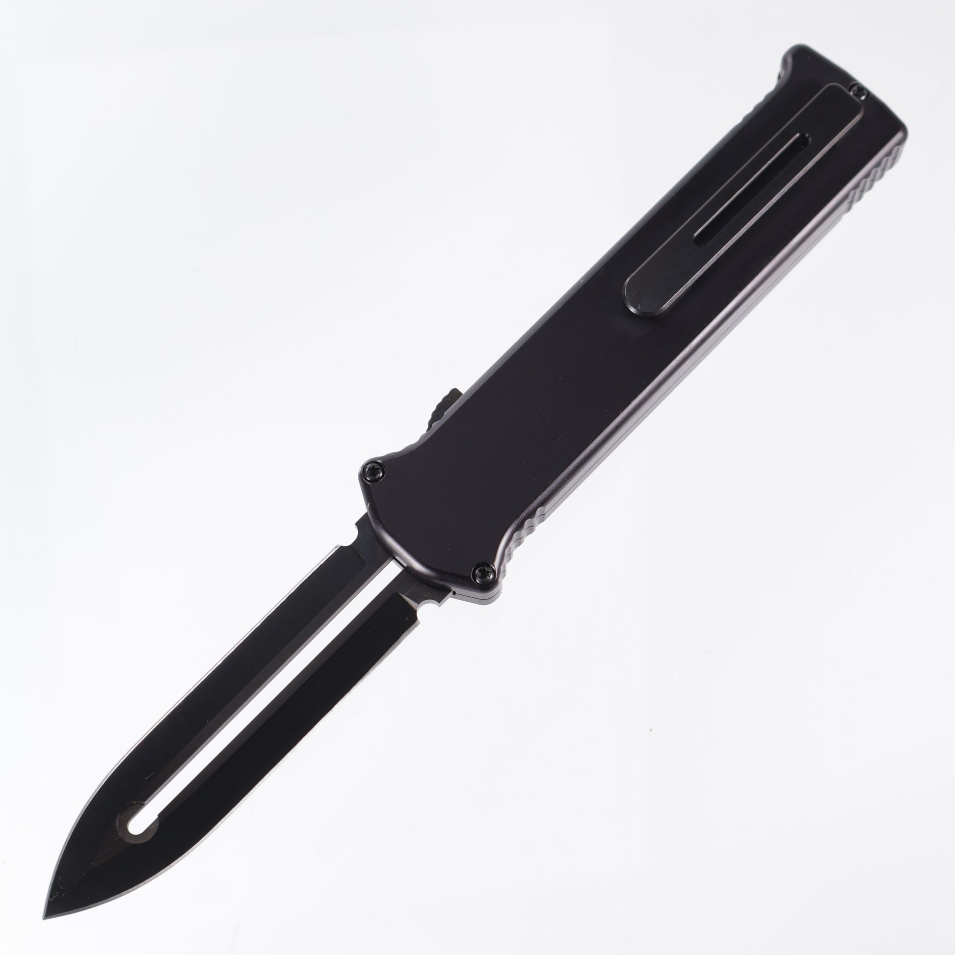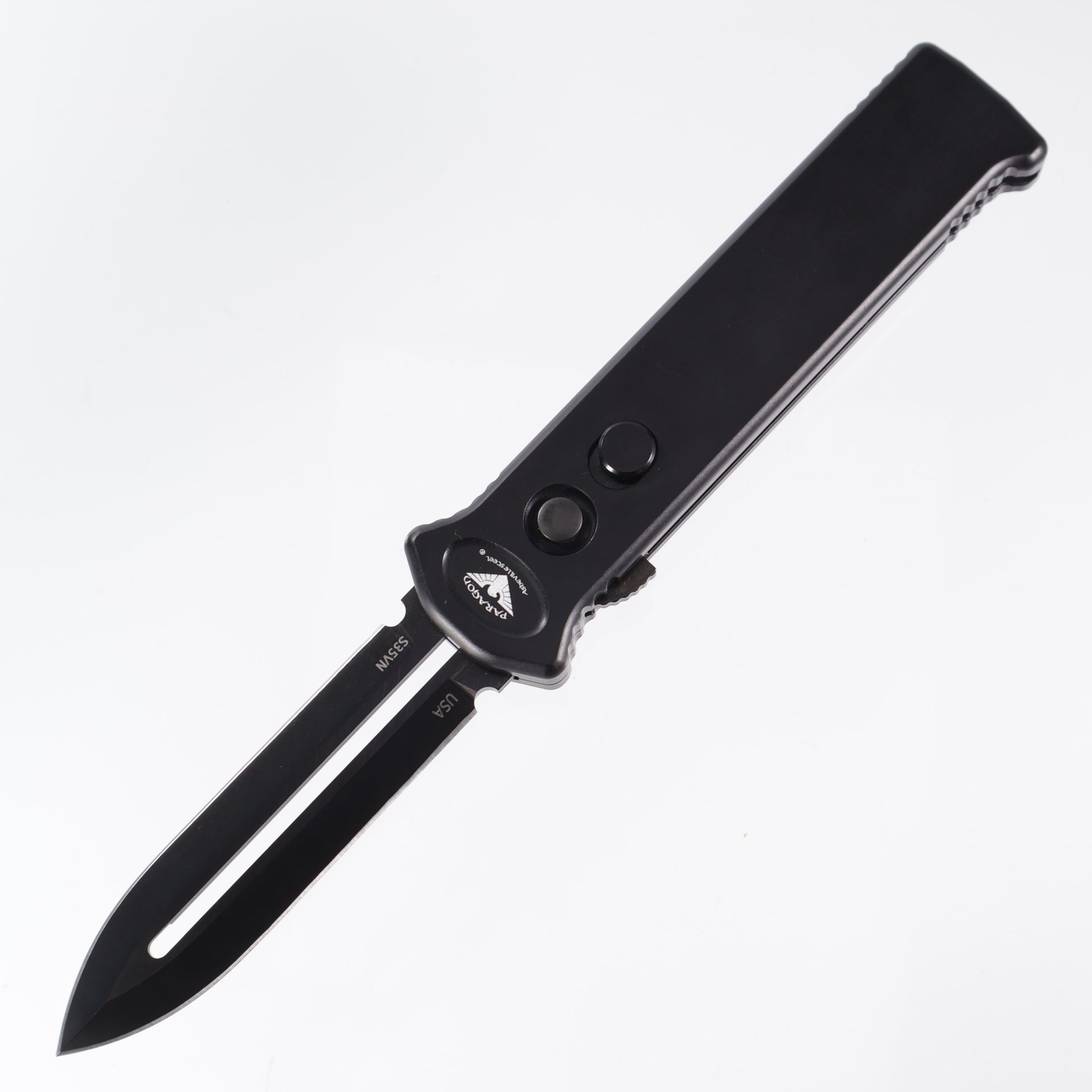 The Paragon PARA-X OTF knife is the next generation of the ATKO-10. This Asheville Steel automatic is a single-action, out-the-front knife. Just push the button and the blade fires out the front of the handle. To close the blade, just press the button and use the retracting lever to pull the blade back in. The PARA-X has a sliding safety under the firing button and a pocket clip for easy tip-down carry. Made in the USA!