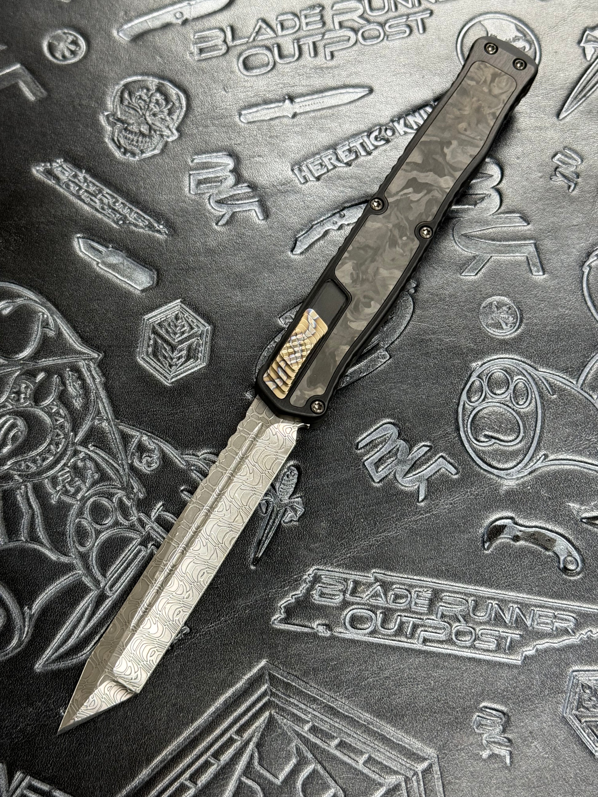 Pre Owned Heretic Knives Custom Cleric II - Tanto - Hand Ground Vegas Forge Polished Damascus, Black Ano handle w/ Marbled CF Inlay, Flamed Ti Button & Clip