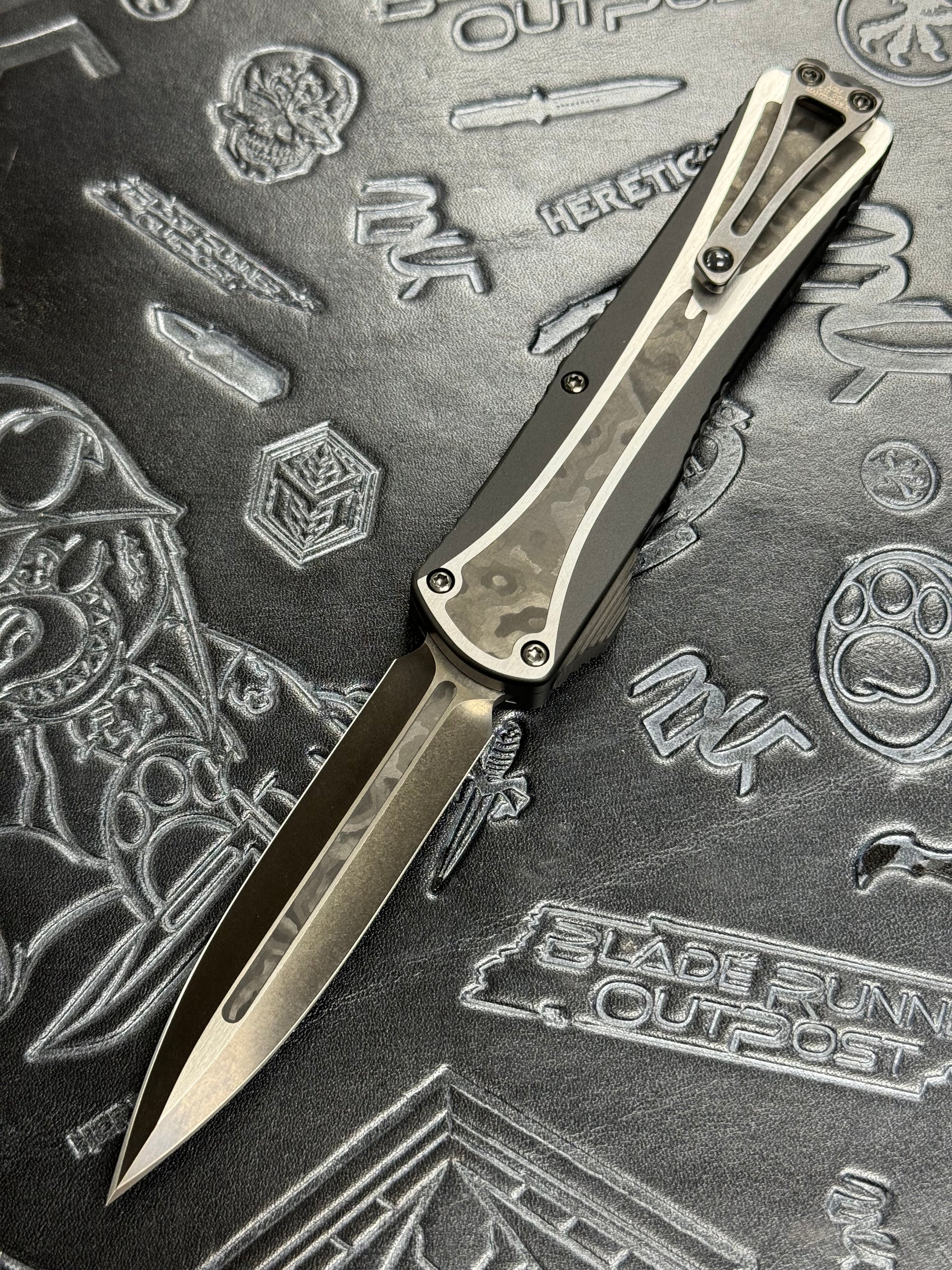 Pre Owned Heretic Knives Custom Manticore-X D/E Custom Doible Edge Fat Carbon Inlay DLC Automatic OTF D/A Knife (3.7)