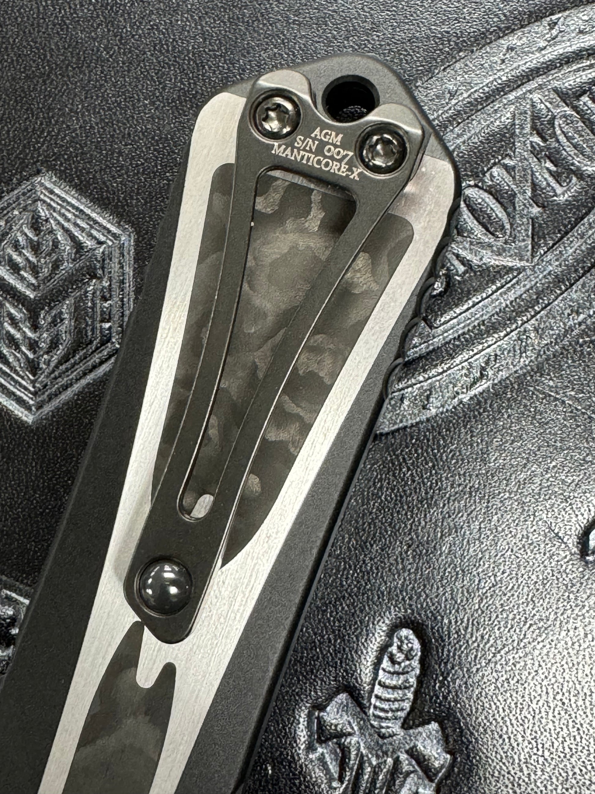 his custom Manticore-X from Heretic Knives features a DLC aluminum handle with hand rubbed satin flats, camo fat carbon fiber inlays on both sides, carbon fiber button, and a DLC D/E blade with fat carbon fiber inlays. This custom knife is decked out and would fit any collection.