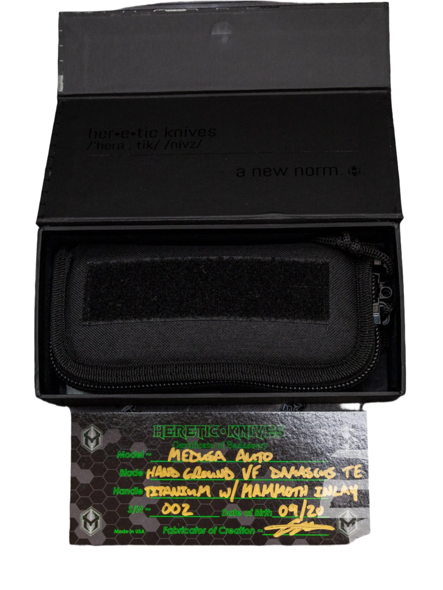 Heretic Knives Medusa Automatic, Titanium w/Mammoth Inlay, Hand Ground Tanto Vegas Forge Ball Bearing Damascus, Entropic Ti Clip/Back Strap Mammoth Button.