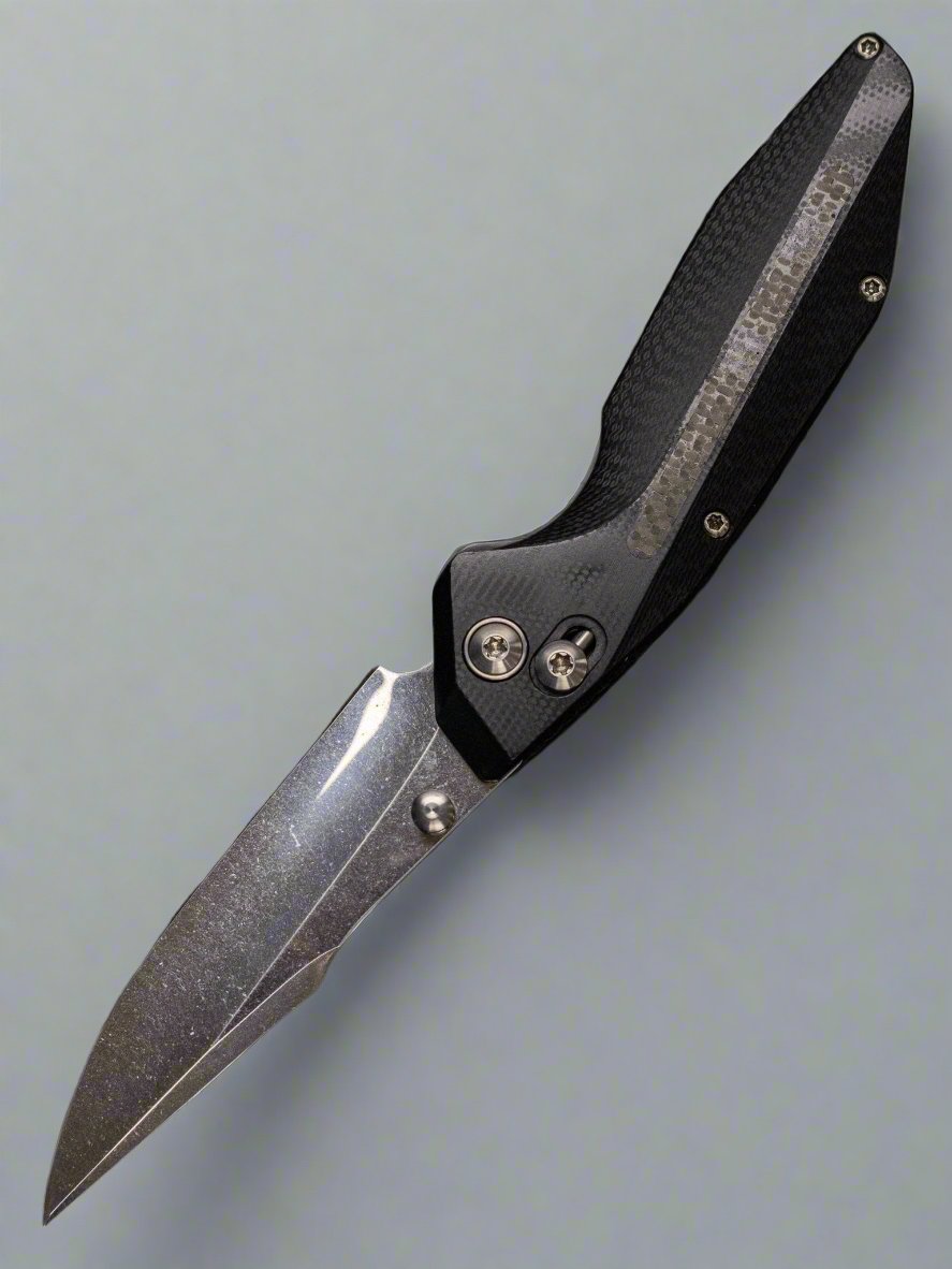 The Banshee is Will Moon's latest custom knife design. It utilizes Will's new "spindle lock" design. You might think of it as a melding of the Benchmade axis lock, and the Spyderco ball bearing lock. However similar, it is distinctly different, and improves upon the design. The spindle lock is stronger and longer lasting, despite its relatively simple design. The knife features a harpoon-shaped 20CV stainless steel blade with a mirrored stonewashed finish on the grinds and polished flats. The handle is two (2) pieces of milled carbon fiber, contoured for comfort and ergonomics in-hand. The thumbstuds, pivot, jeweled tip-up mounted pocket clip and titanium plates that house the spindle mechanism are all anodized green. The pocket clip features a Todd Begg style ceramic ball to ease it into your pocket, as well as retention. Will also utilizes what he calls a "Jelly Bean", that stands-off the pocket clip from the carbon fiber handle scale.