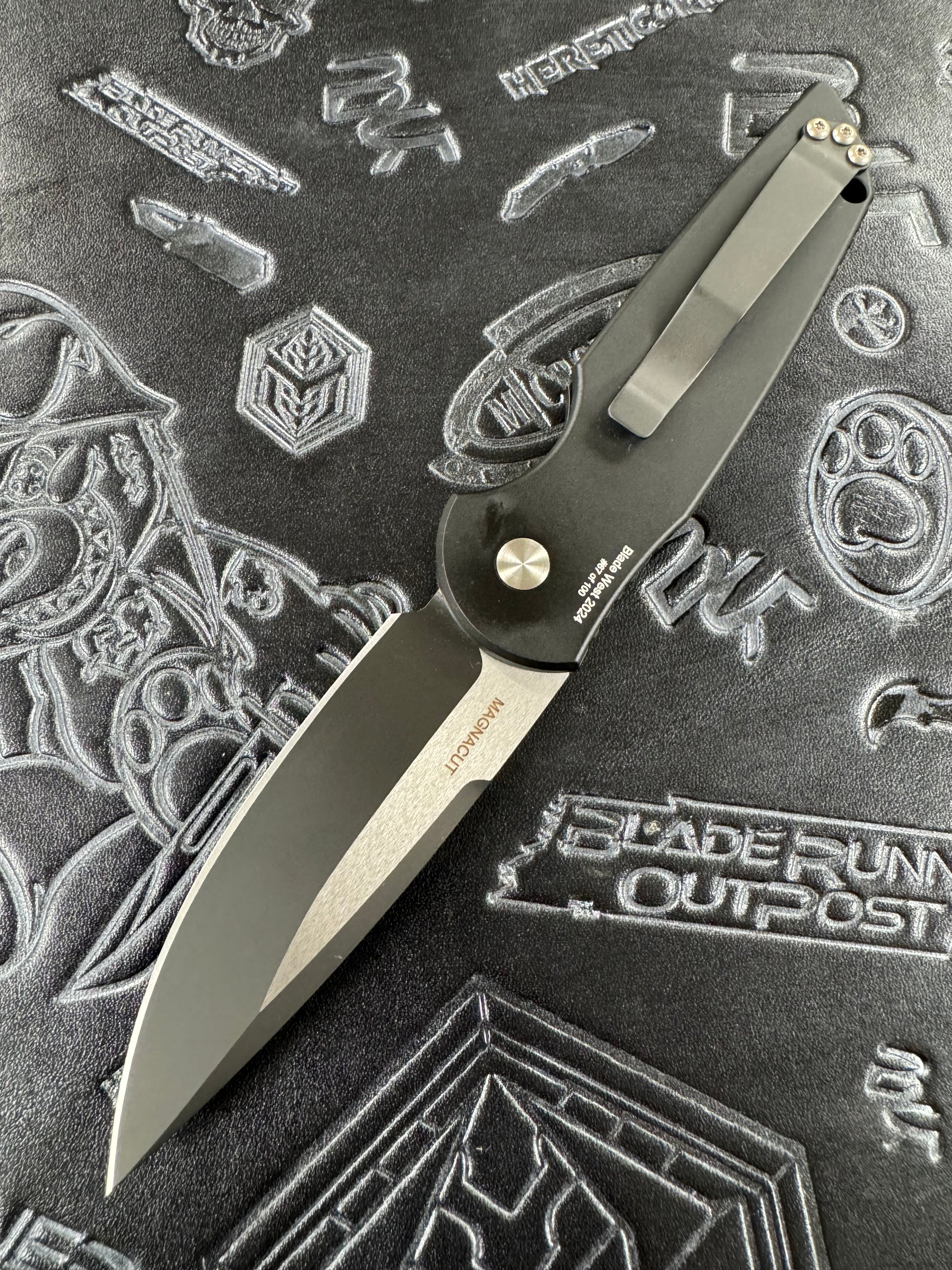 Pro-Tech Knives TR-3 Tactical Response 3 2024 Blade Show West 03 Black handle with Grooves Auto Folder Knife 2-Tone DLC Black and Satin Magnacut Blade 3.5, Abalone Button