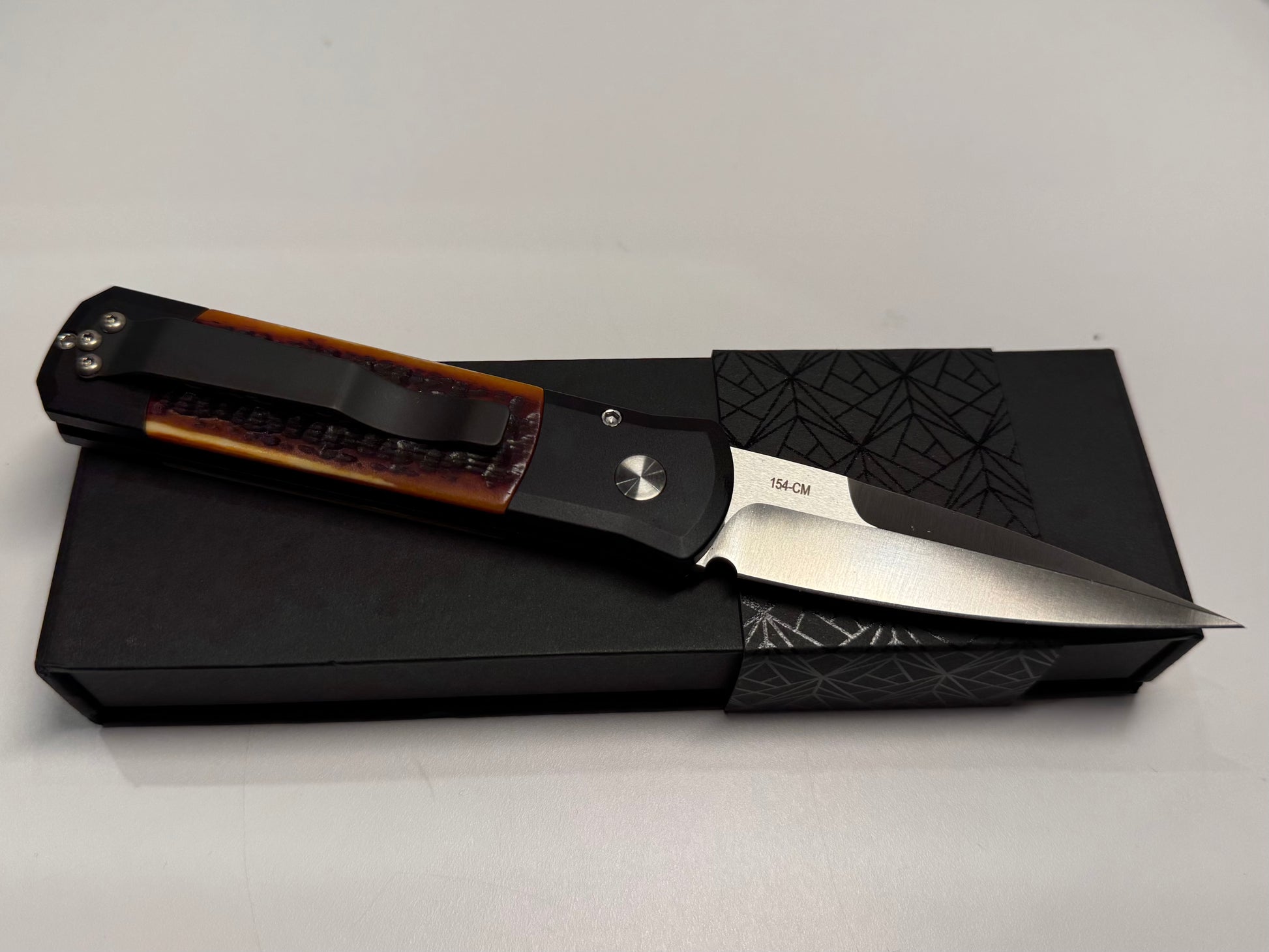 Protech Godson featuring jigged bone inlays, a mosaic pin button & satin blade!